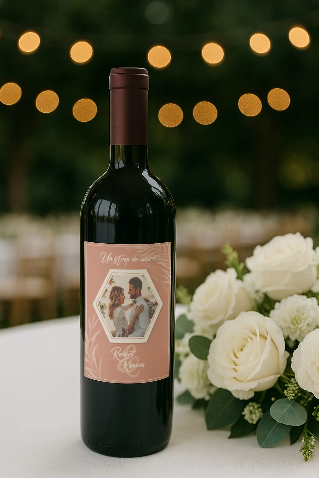 Această etichetă elegantă, în format 90x120 mm, cu detalii florale discrete în nuanțe corai și spațiu pentru poza mirilor, adaugă un plus de distincție unei nunți memorabile.