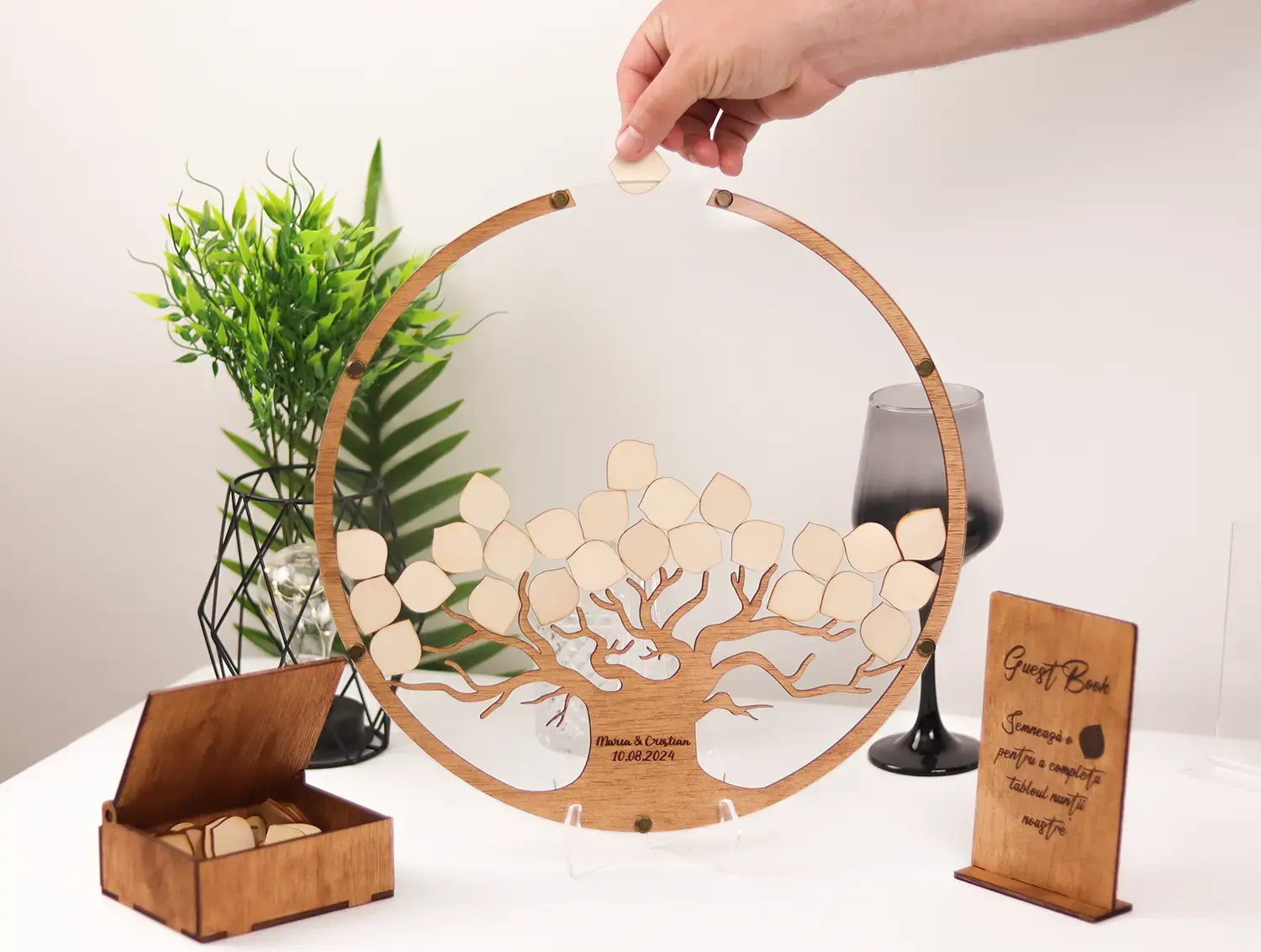 Alege un guestbook interactiv pentru ziua voastră specială: un copac din plexiglas unde invitații lasă frunze cu mesaje pe ramuri. În plus, agendă din lemn inclusă pentru urări și gânduri sincere.