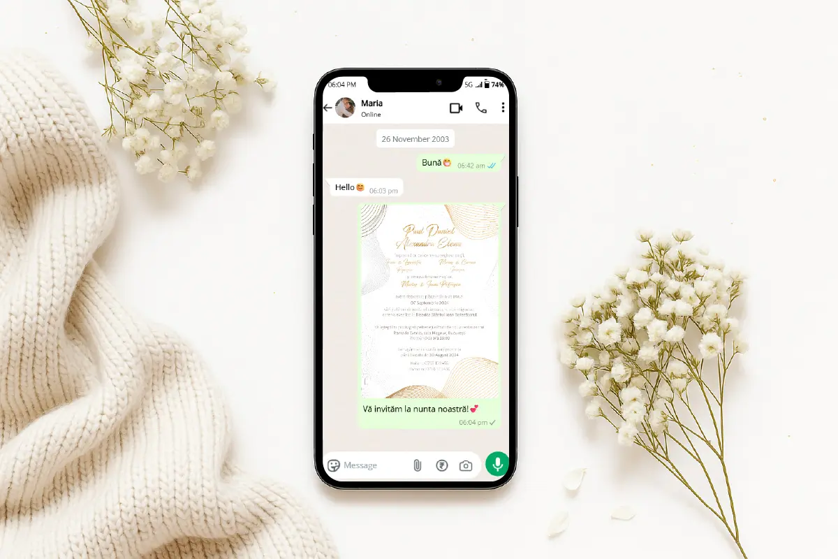 După plasarea comenzii, vei fi contactat telefonic sau prin WhatsApp pentru personalizarea invitației tale (nume miri, dată, locație, mesaj personalizat). După confirmarea detaliilor, designerul nostru va personaliza rapid invitația, iar tu o vei primi în format JPG și PNG, gata pentru a fi distribuită.
