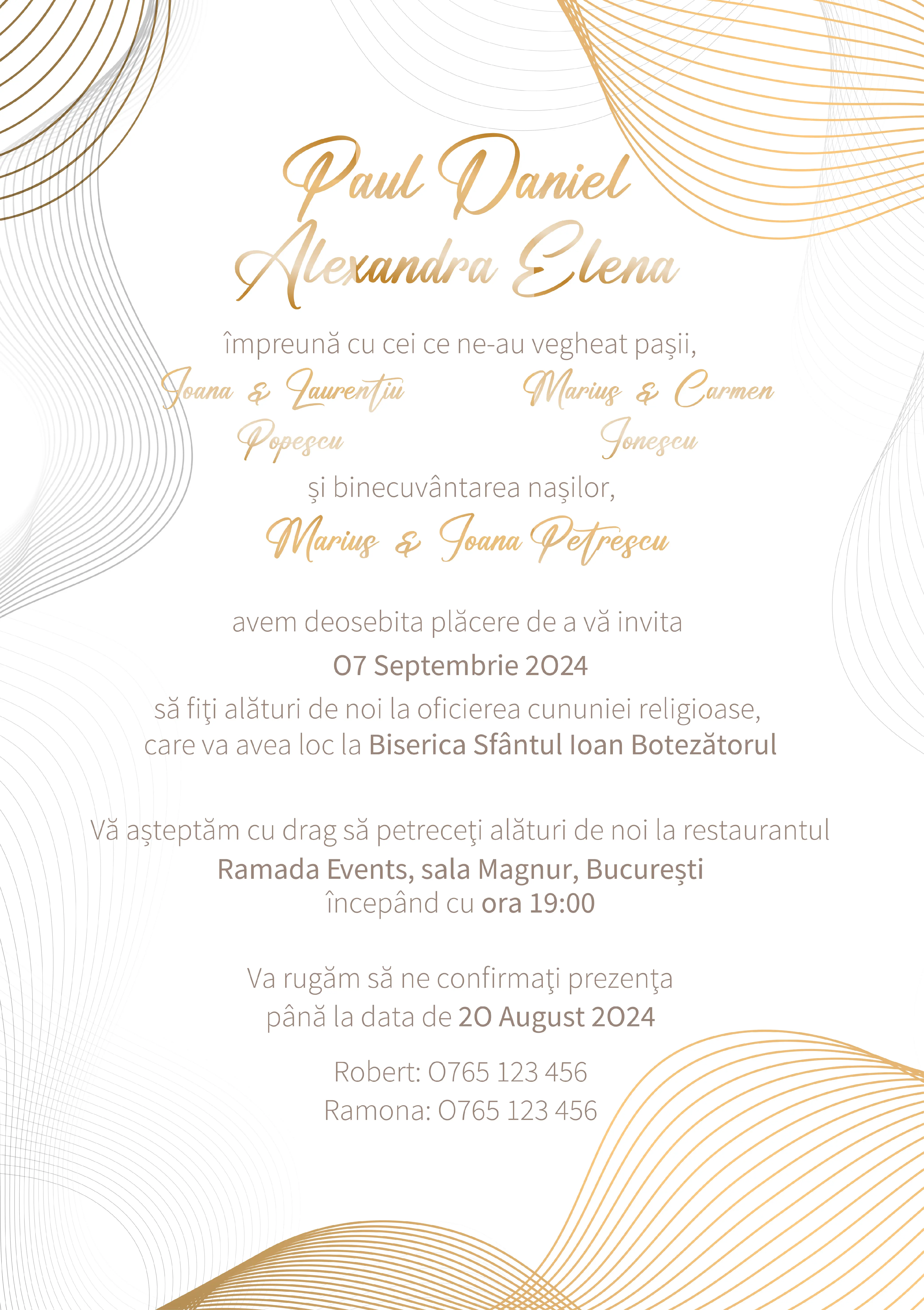 Surprinde-ți invitații cu o invitație digitală elegantă, modernă și personalizată, perfectă pentru a fi distribuită rapid prin WhatsApp, e-mail sau rețelele sociale. Modelul „Golden Waves” impresionează printr-un design contemporan, unde liniile aurii delicate și fundalul alb imaculat creează un design sofisticat prin simplitatea sa.