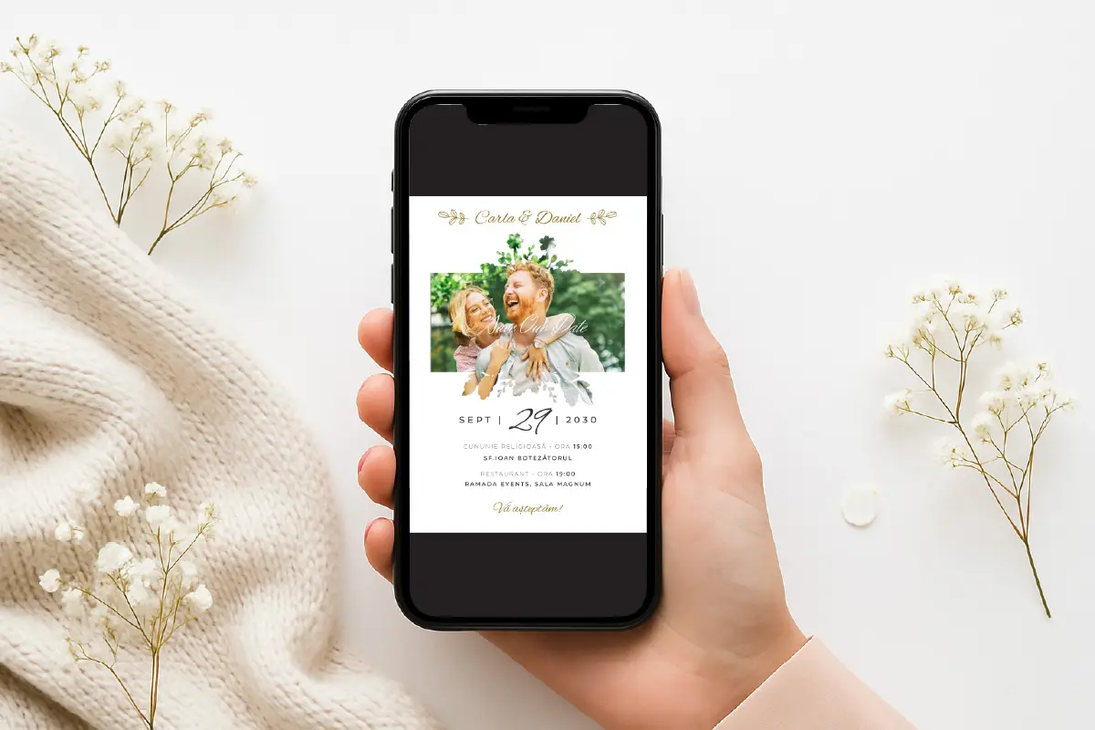 După plasarea comenzii, vei fi contactat telefonic sau prin WhatsApp pentru personalizarea invitației tale (nume miri, dată, locație, mesaj personalizat). După confirmarea detaliilor, designerul nostru va personaliza rapid invitația, iar tu o vei primi în format JPG și PNG, gata pentru a fi distribuită.