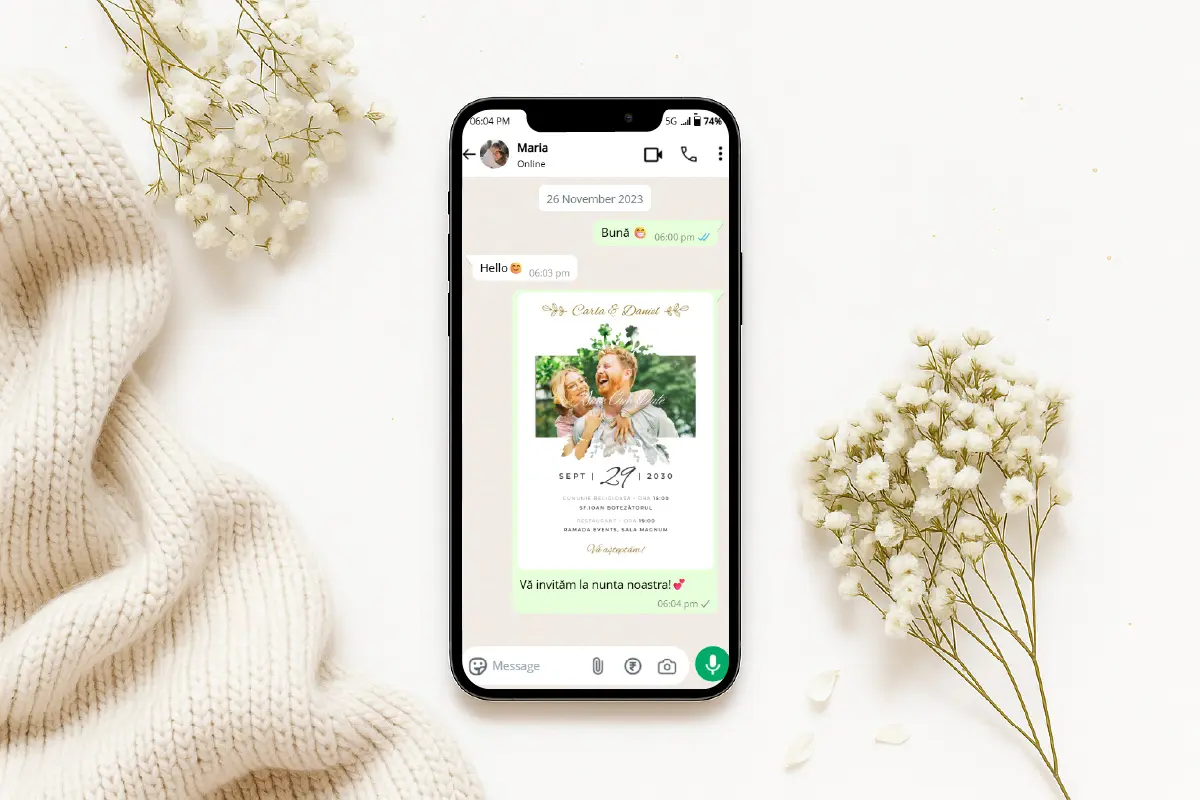 Comandă invitația digitală de nuntă „Love in Bloom”. Personalizare rapidă cu textele dorite. Distribuire simplă pe WhatsApp și social media.