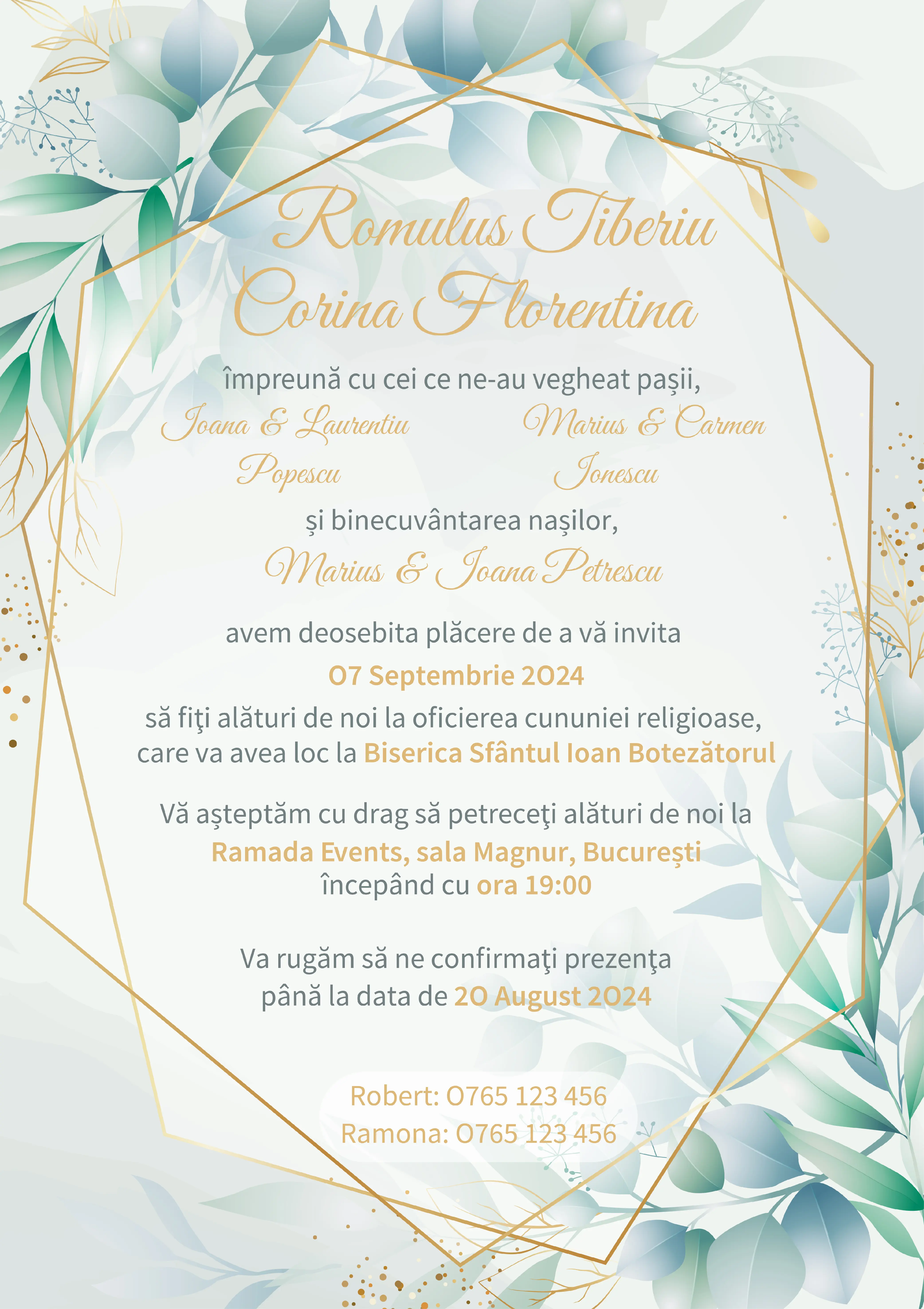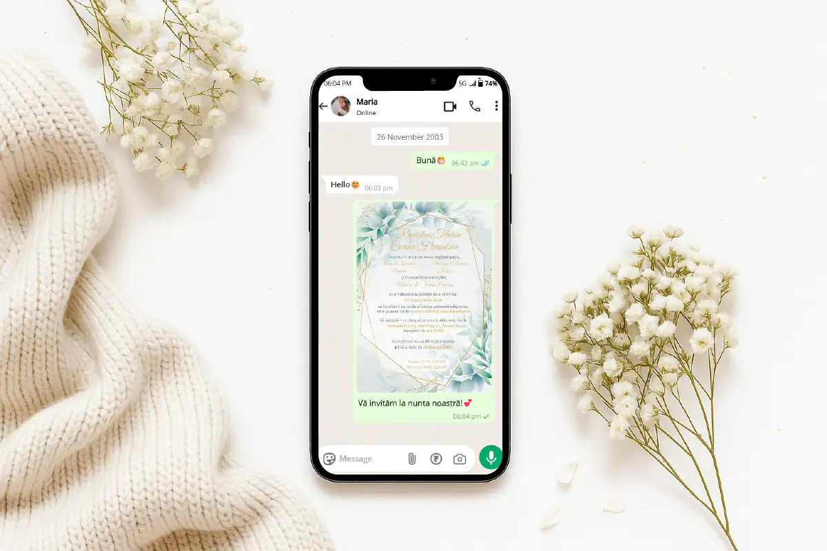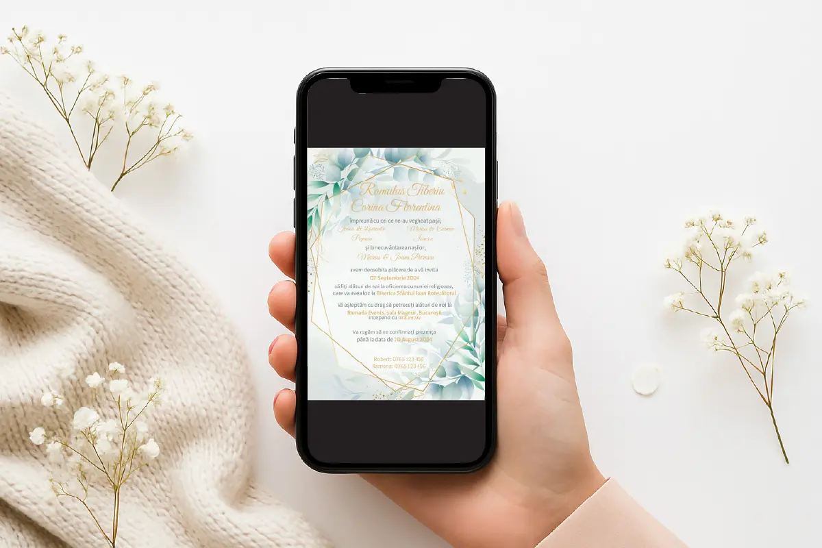 După plasarea comenzii, vei fi contactat telefonic sau prin WhatsApp pentru personalizarea invitației tale (nume miri, dată, locație, mesaj personalizat). După confirmarea detaliilor, designerul nostru va personaliza rapid invitația, iar tu o vei primi în format JPG și PNG, gata pentru a fi distribuită.