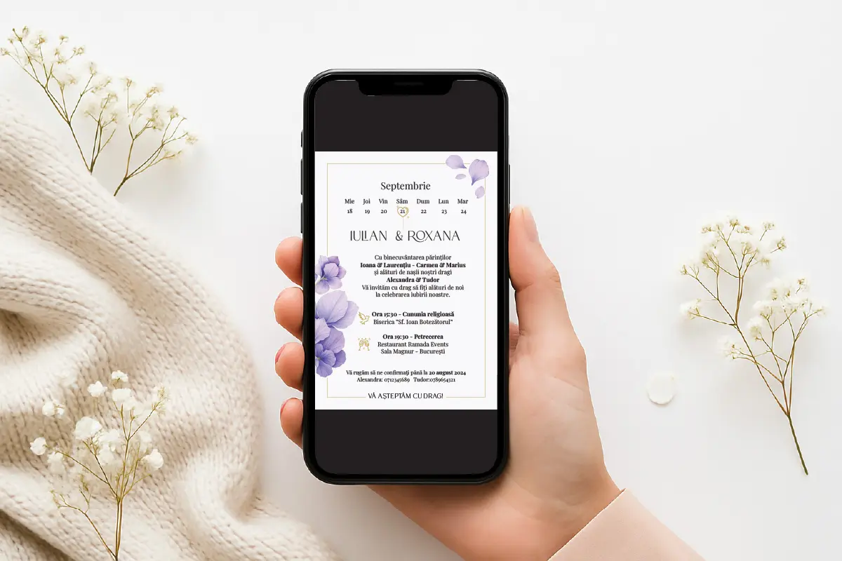 Comandă invitația digitală de nuntă „Purple Dream”. Personalizare rapidă cu textele dorite. Distribuire simplă pe WhatsApp și social media.