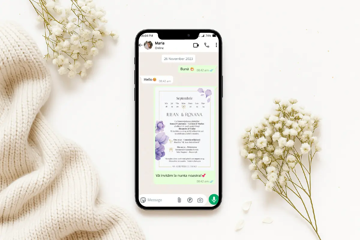 După plasarea comenzii, vei fi contactat telefonic sau prin WhatsApp pentru personalizarea invitației tale (nume miri, dată, locație, mesaj personalizat). După confirmarea detaliilor, designerul nostru va personaliza rapid invitația, iar tu o vei primi în format JPG și PNG, gata pentru a fi distribuită.