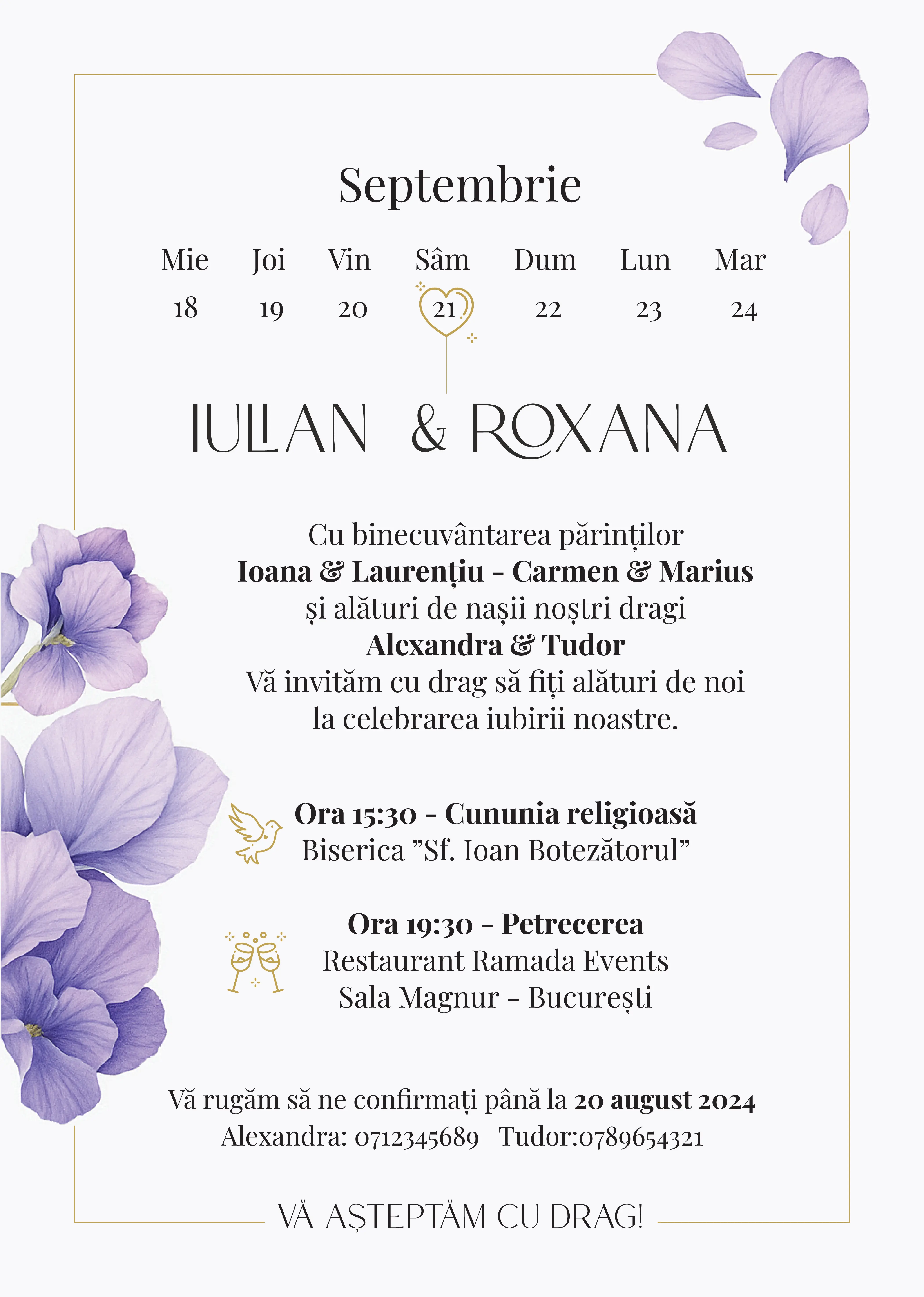 Surprinde-ți invitații cu o invitație digitală elegantă, modernă și personalizată, perfectă pentru a fi distribuită rapid prin WhatsApp, e-mail sau rețelele sociale. Modelul „Purple Dream” combină elemente botanice în nuanțe de violet cu accente aurii. Este potrivită pentru nunți cu tematică elegantă.