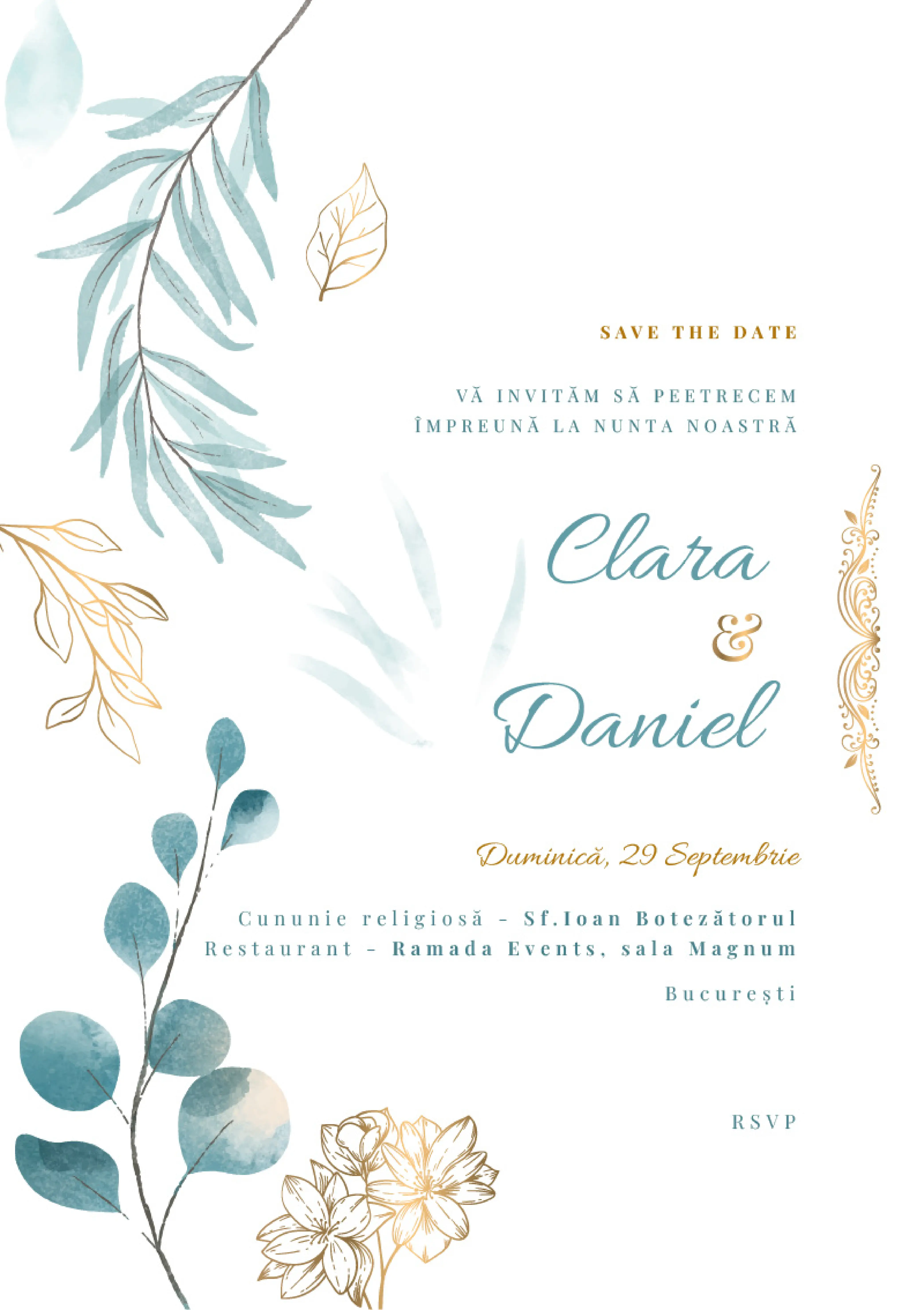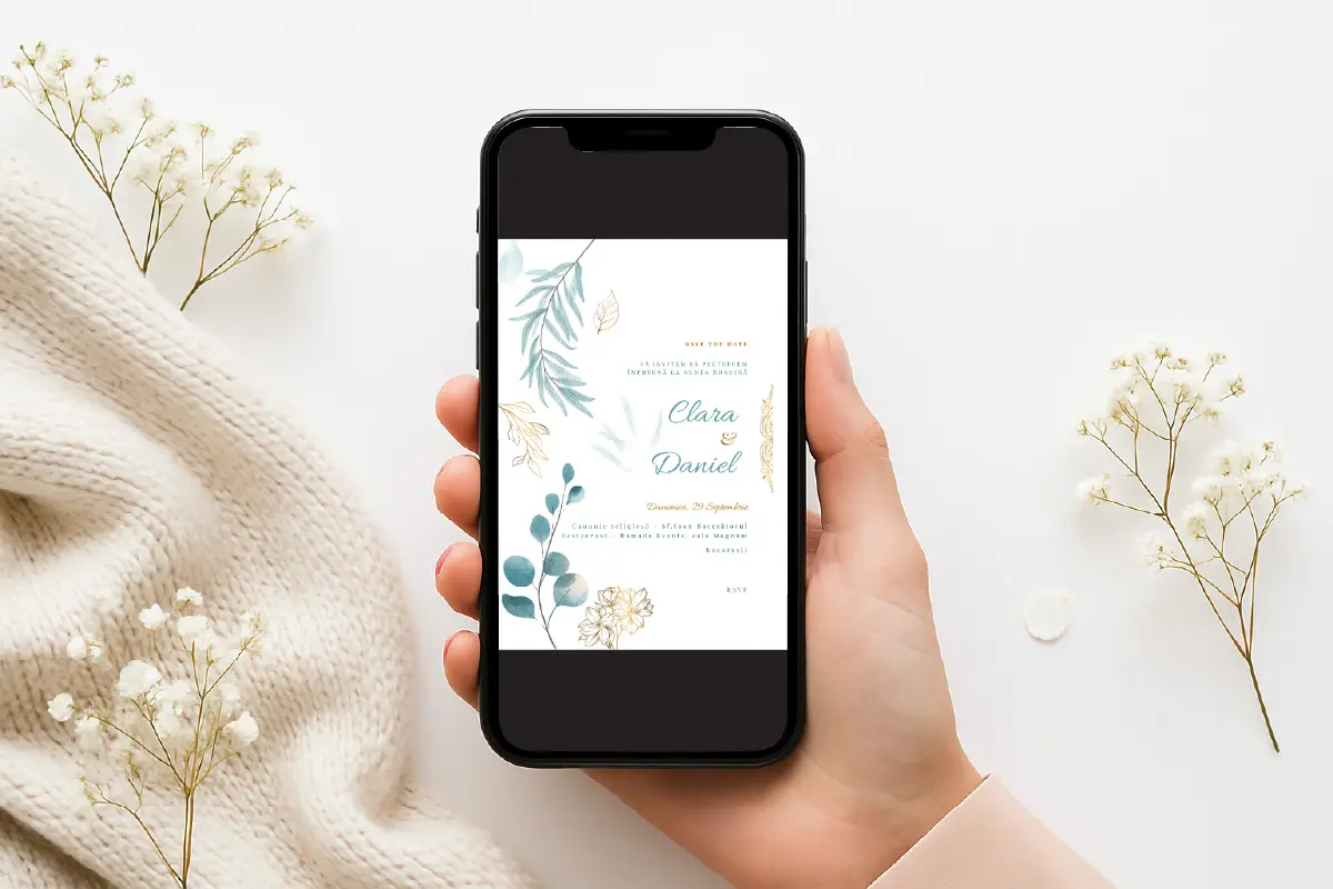 Surprinde-ți invitații cu o invitație digitală elegantă, modernă și personalizată, perfectă pentru a fi distribuită rapid prin WhatsApp, e-mail sau rețelele sociale. Modelul „Serene Celebration” este compus din frunze și flori acuarelă în tonuri de albastru-verde pastel, cu un layout aerisit și armonios. Este potrivită pentru nunți relaxate, cu tematici boho, naturale sau rustice.