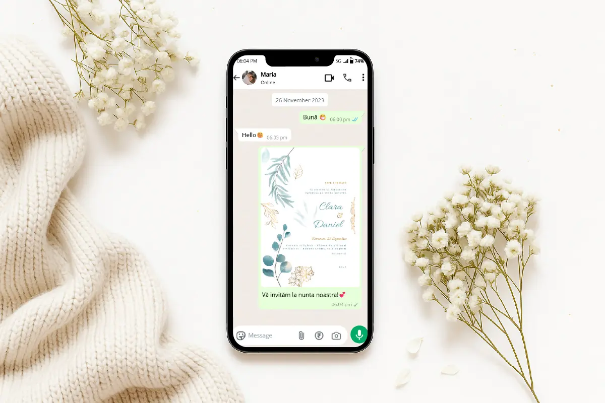 După plasarea comenzii, vei fi contactat telefonic sau prin WhatsApp pentru personalizarea invitației tale (nume miri, dată, locație, mesaj personalizat). După confirmarea detaliilor, designerul nostru va personaliza rapid invitația, iar tu o vei primi în format JPG și PNG, gata pentru a fi distribuită.