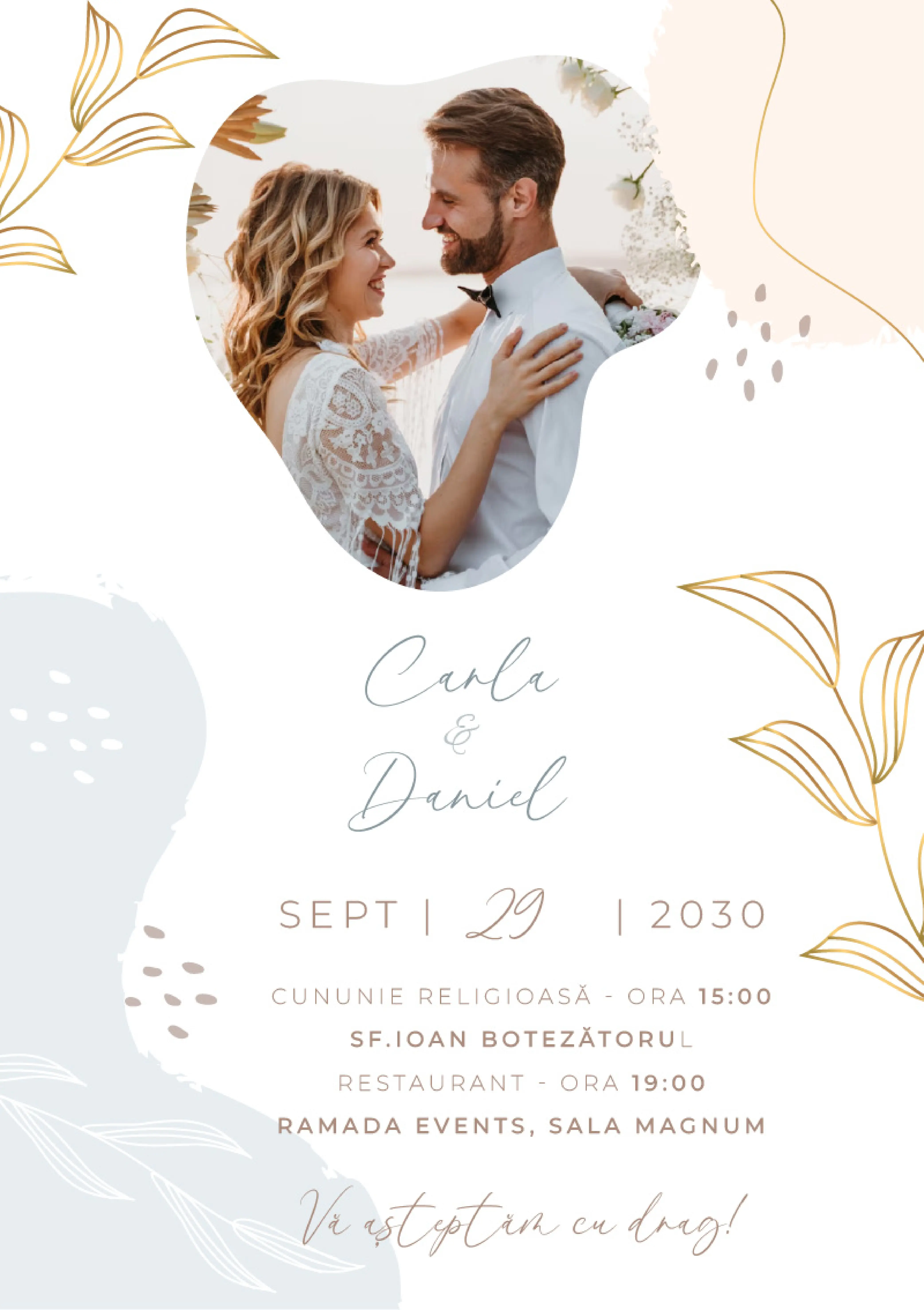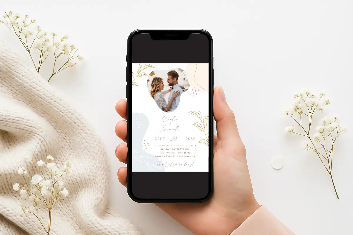 Surprinde-ți invitații cu o invitație digitală elegantă, modernă și personalizată, perfectă pentru a fi distribuită rapid prin WhatsApp, e-mail sau rețelele sociale. Modelul „Soft Petals” se remarcă prin forme abstracte și detalii aurii stilizate ce încadrează fotografia voastră preferată. Este ideal pentru nunți moderne, rafinate și pline de emoție caldă.