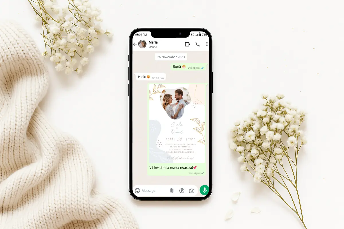 După plasarea comenzii, vei fi contactat telefonic sau prin WhatsApp pentru personalizarea invitației tale (nume miri, dată, locație, mesaj personalizat). După confirmarea detaliilor, designerul nostru va personaliza rapid invitația, iar tu o vei primi în format JPG și PNG, gata pentru a fi distribuită.