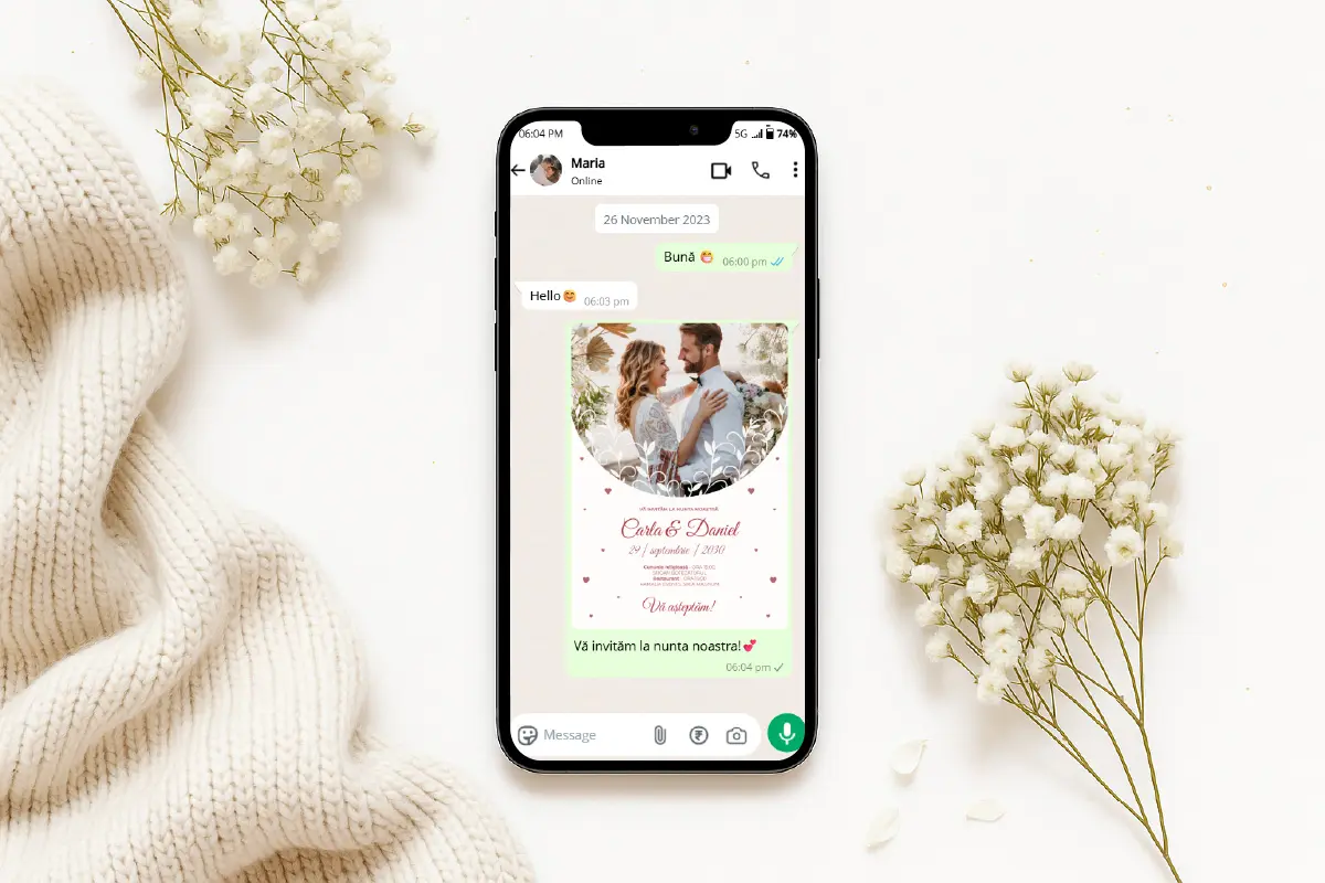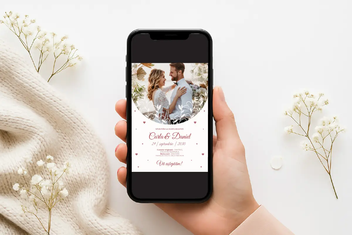 După plasarea comenzii, vei fi contactat telefonic sau prin WhatsApp pentru personalizarea invitației tale (nume miri, dată, locație, mesaj personalizat). După confirmarea detaliilor, designerul nostru va personaliza rapid invitația, iar tu o vei primi în format JPG și PNG, gata pentru a fi distribuită.