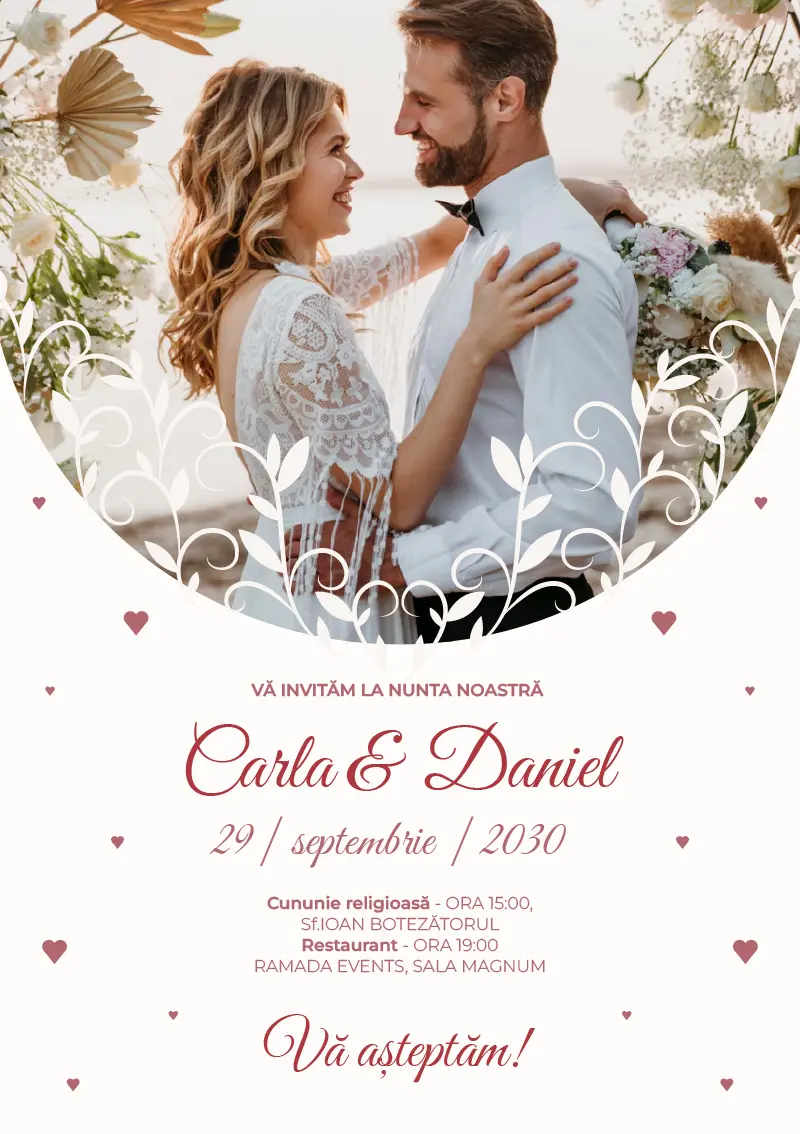 Surprinde-ți invitații cu o invitație digitală elegantă, modernă și personalizată, perfectă pentru a fi distribuită rapid prin WhatsApp, e-mail sau rețelele sociale. Modelul „Sweet Hearts” are o compoziție romantică, cu inimioare și elemente florale albe care încadrează fotografia de cuplu într-un mod delicat. Este potrivită pentru nunți romantice, intime sau cu o tematică clasică.
