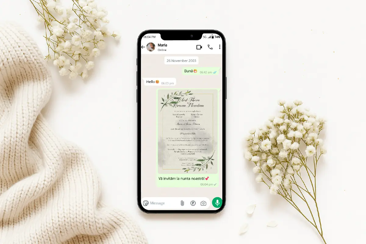 După plasarea comenzii, vei fi contactat telefonic sau prin WhatsApp pentru personalizarea invitației tale (nume miri, dată, locație, mesaj personalizat). După confirmarea detaliilor, designerul nostru va personaliza rapid invitația, iar tu o vei primi în format JPG și PNG, gata pentru a fi distribuită.
