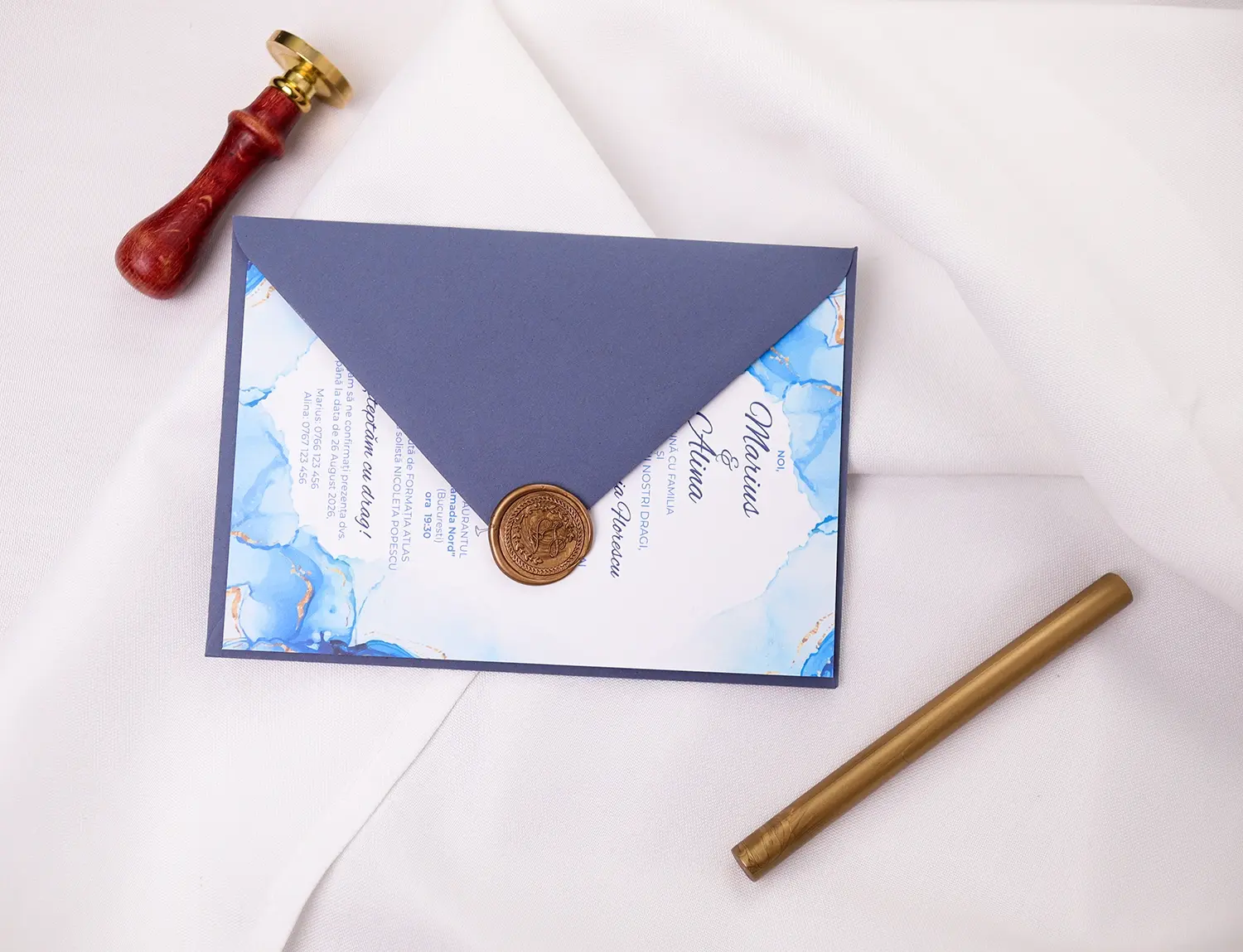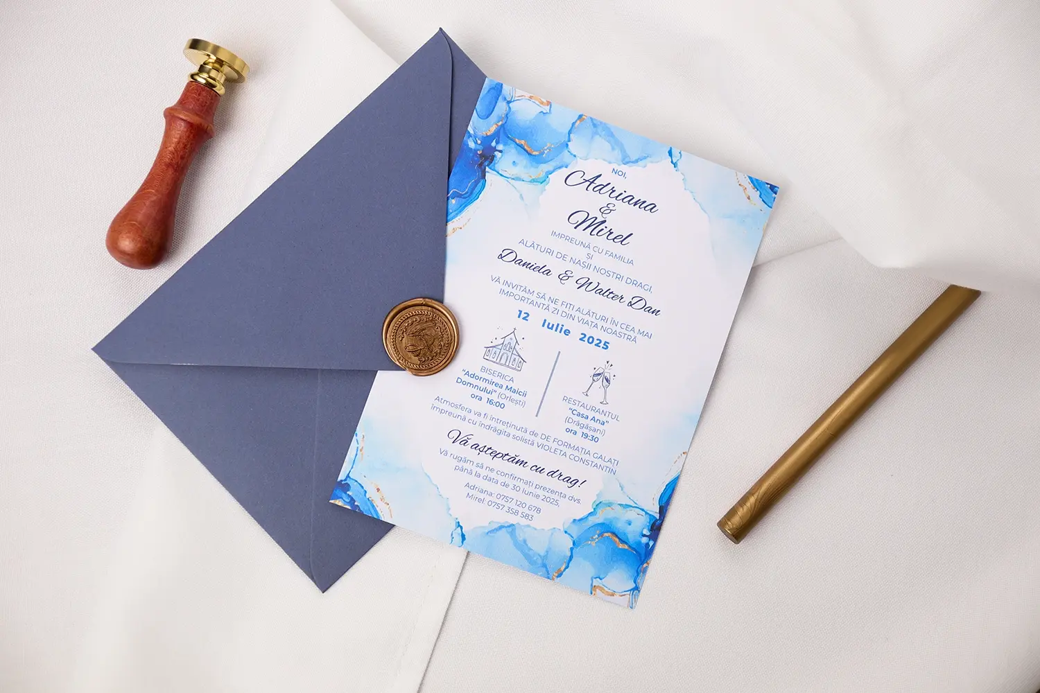 Această invitație se remarcă printr-un fundal fluid, asemenea undelor linștite ale mării. Tușele aurii, aplicate cu finețe, străbat fundalul albastru ca razele soarelui reflectate pe suprafața apei, aducând un strop de luminozitate și rafinament întregii compoziții. Acest design evocă o atmosferă calmă și elegantă, perfectă pentru o ceremonie deosebită. 📜🌊💙