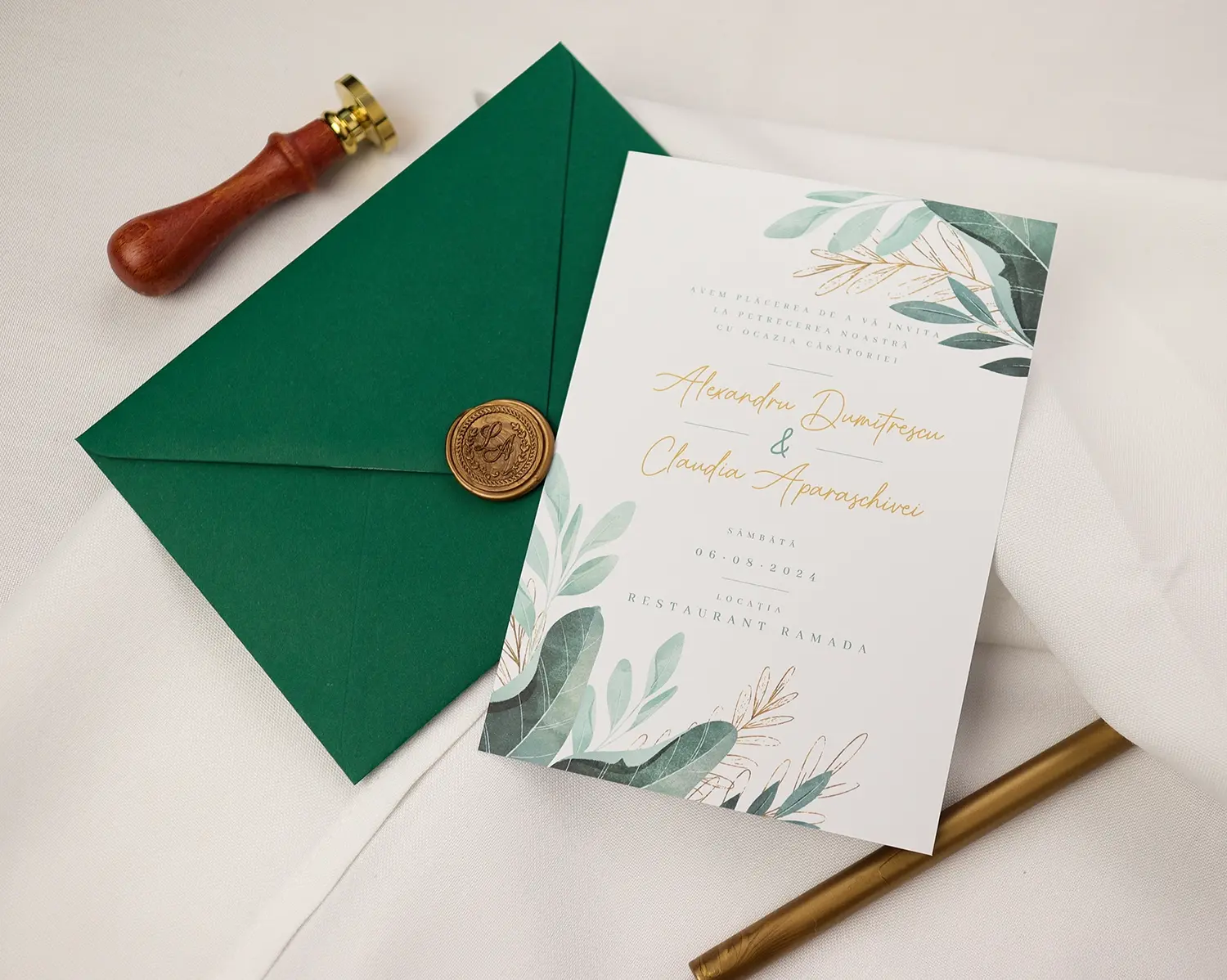 Această invitație combină elemente botanice cu note aurii sofisticate. Fundalul alb și frunzele pictate în acuarelă creează o atmosferă proaspătă și armonioasă. Este potrivită pentru nunți cu tematică elegantă sau de inspirație rustică. 🌿✨📃