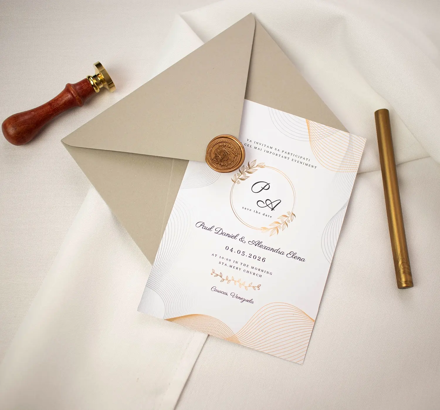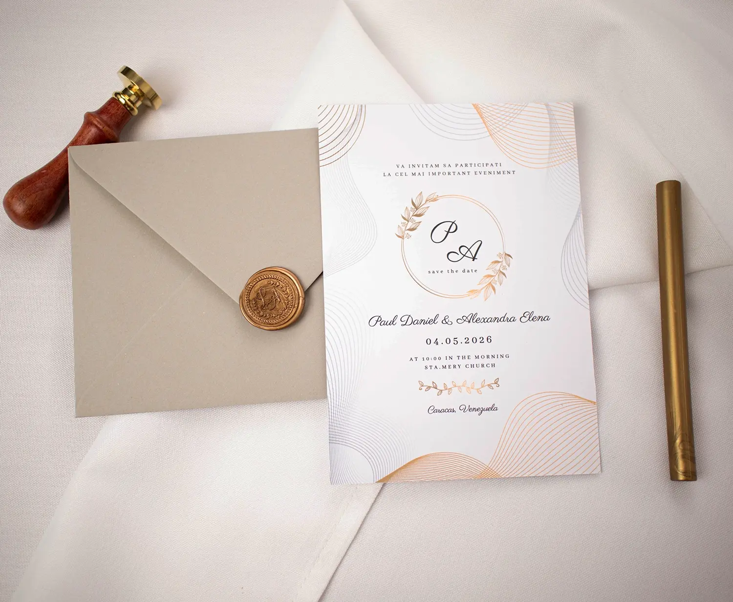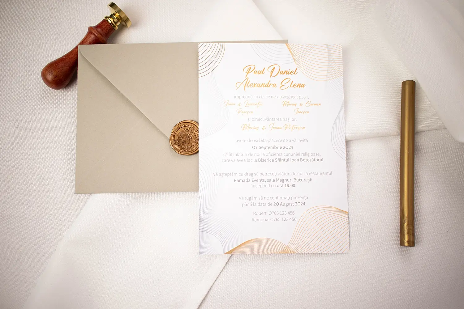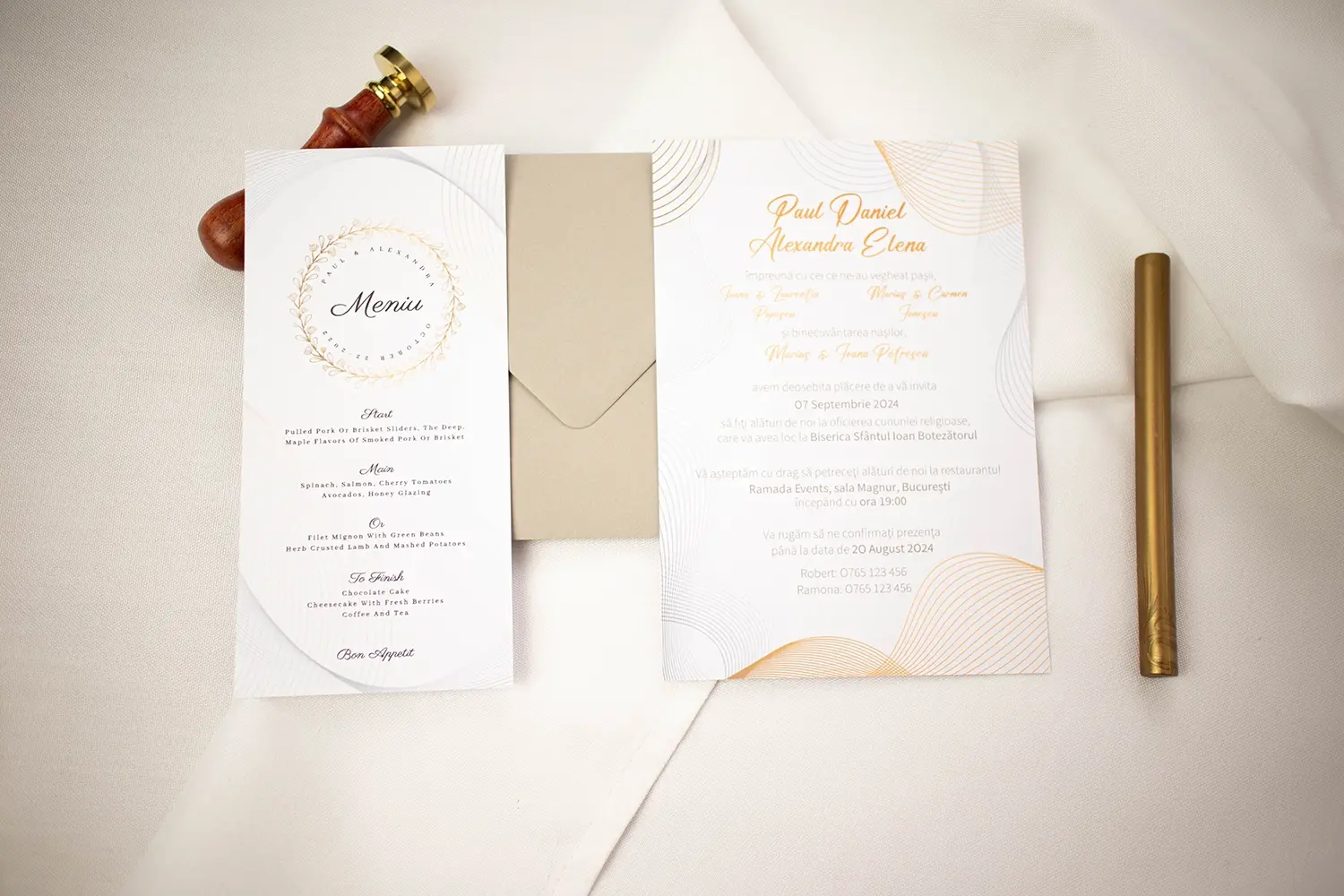 O invitație elegantă, cu accente aurii minimaliste, perfectă pentru o nuntă rafinată și contemporană.