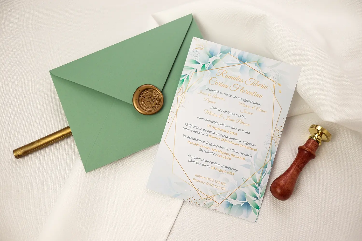 Această invitație emană rafinament și naturalețe, datorită nuanțelor blânde de verde și albastru, care creează un efect vizual liniștitor. Chenarul geometric din centru alături de accentele aurii adaugă un plus de eleganță. Se potrivește de minune pentru o nuntă clasică, sofisticată sau în aer liber. 🔔🍃🩵
