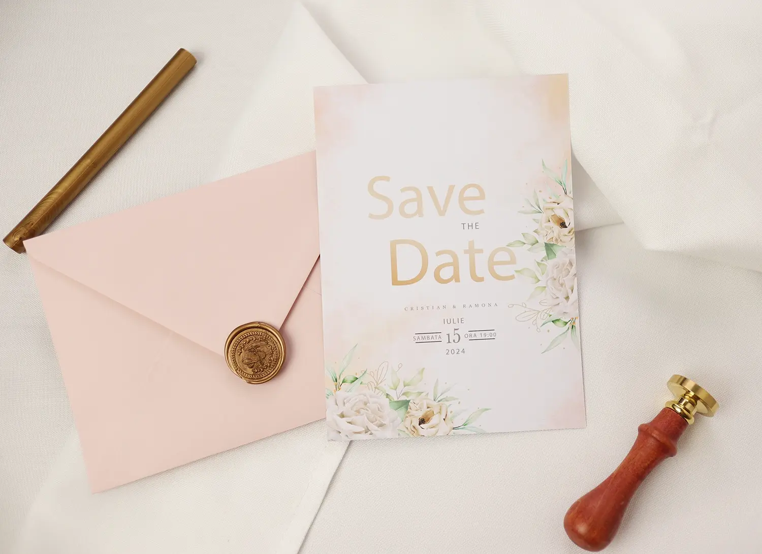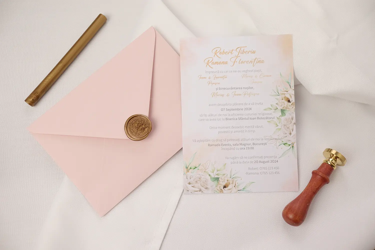 O invitație delicată, cu nuanțe pastelate și accente florale delicate, pentru o nuntă de vis.