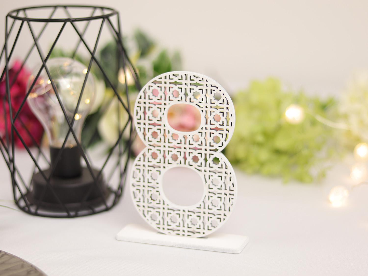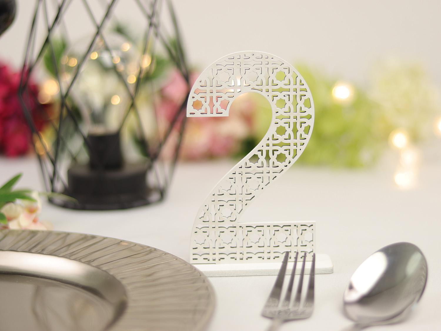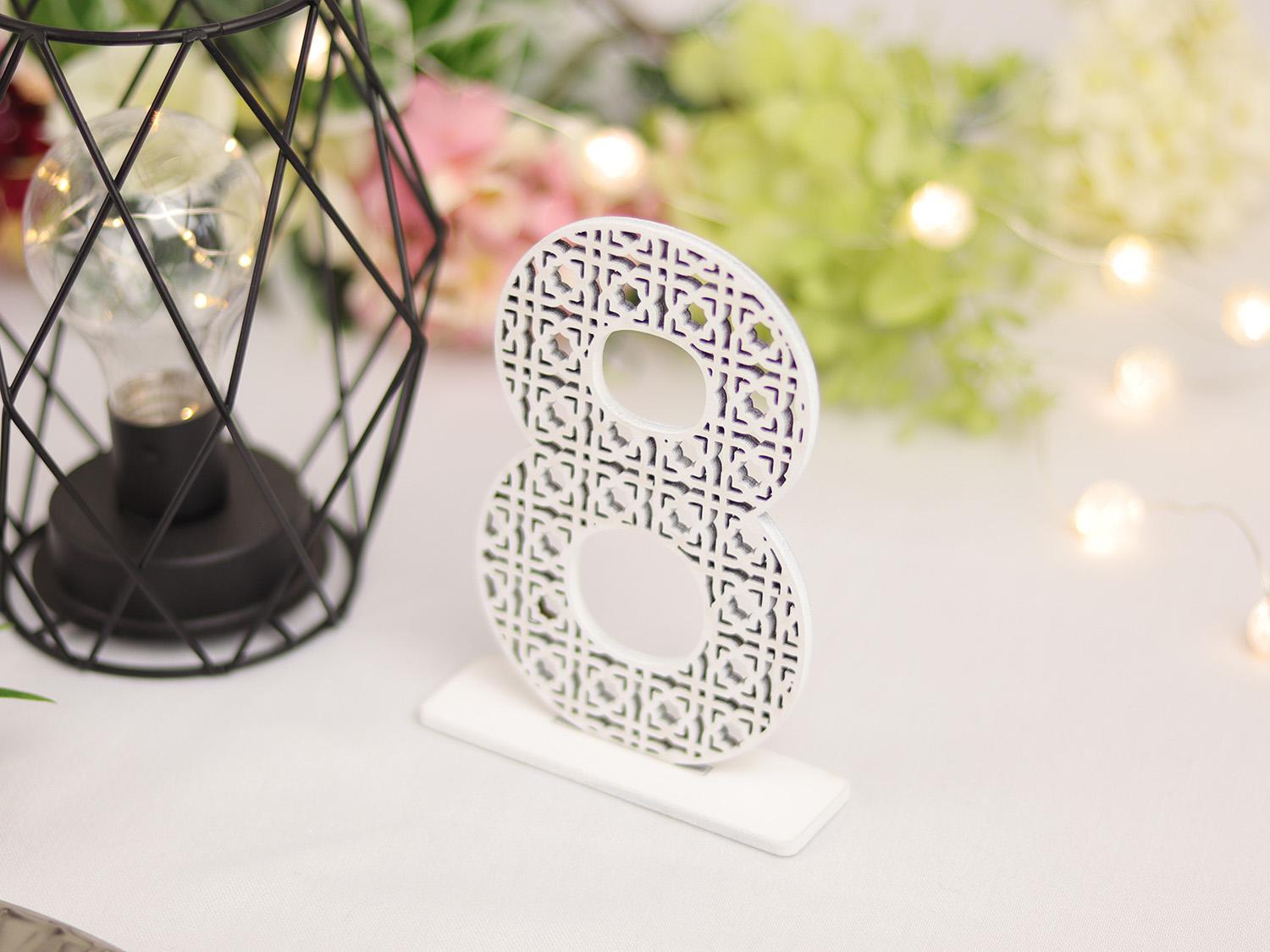 Transformă mesele invitaților într-un adevărat spectacol vizual cu numerele de masă din lemn cu pattern oriental, tăiate pe laser și vopsite alb.