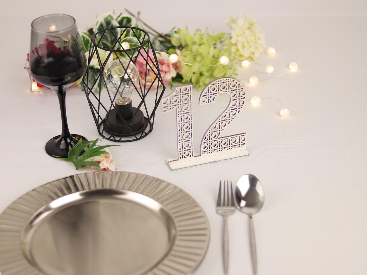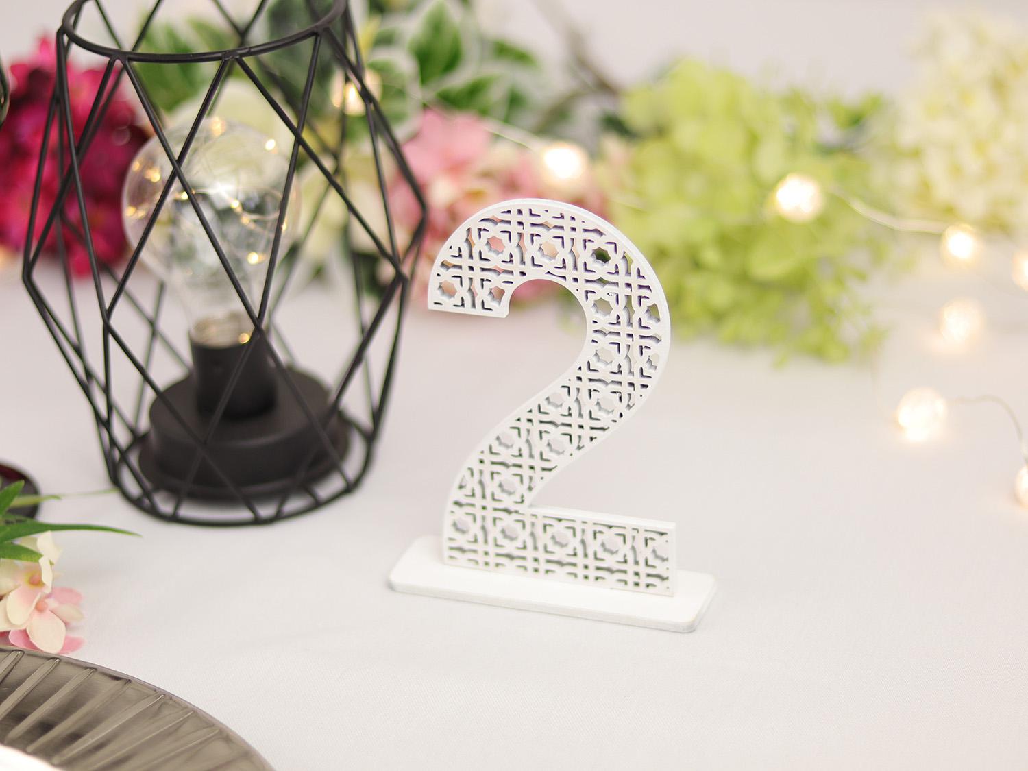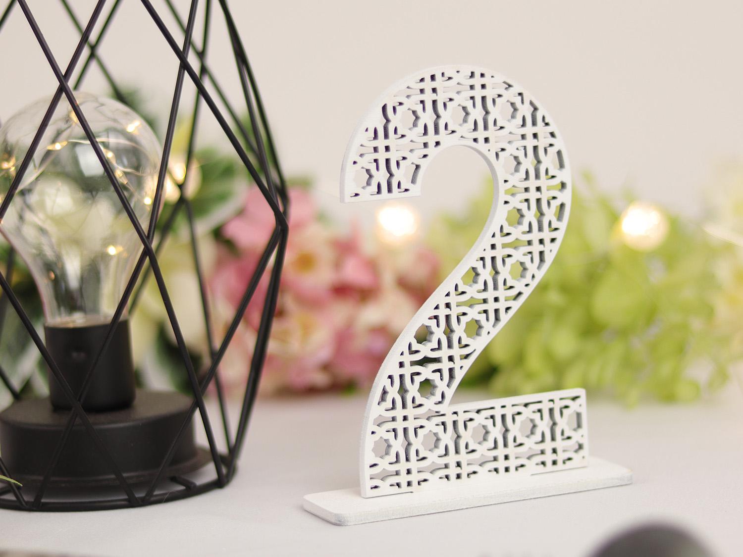 Transformă mesele invitaților într-un adevărat spectacol vizual cu numerele de masă din lemn cu pattern oriental, tăiate pe laser și vopsite alb.