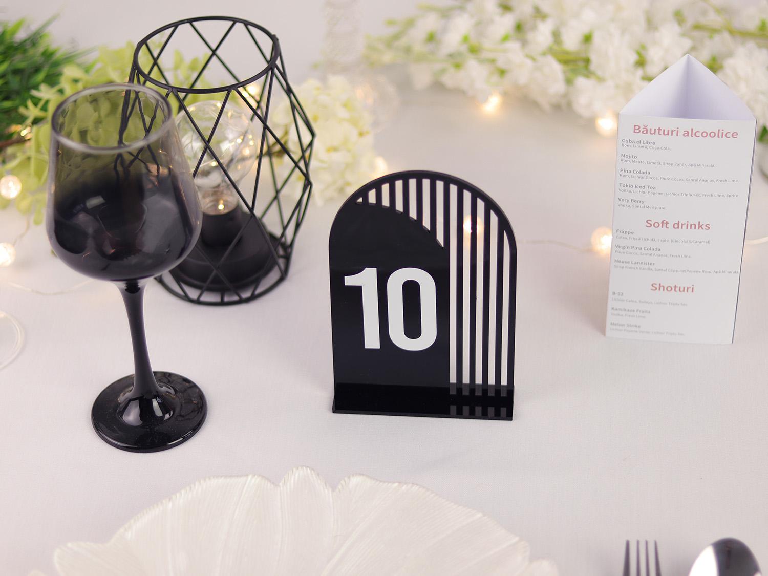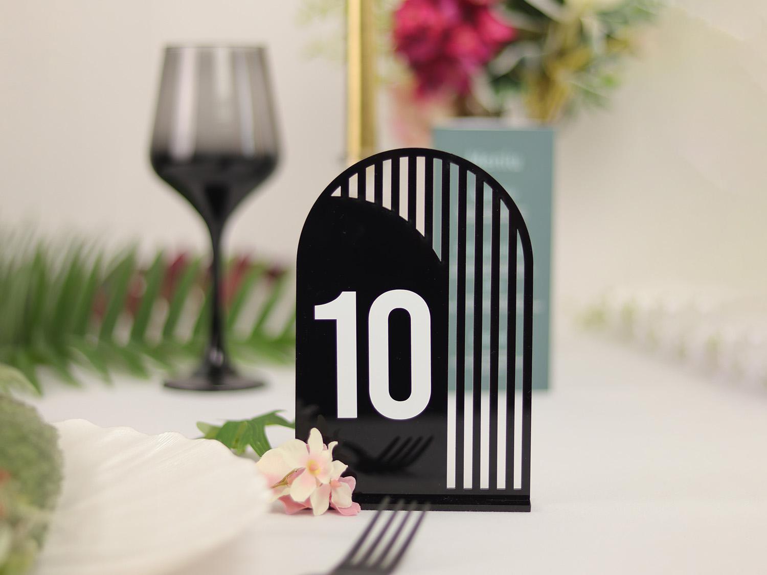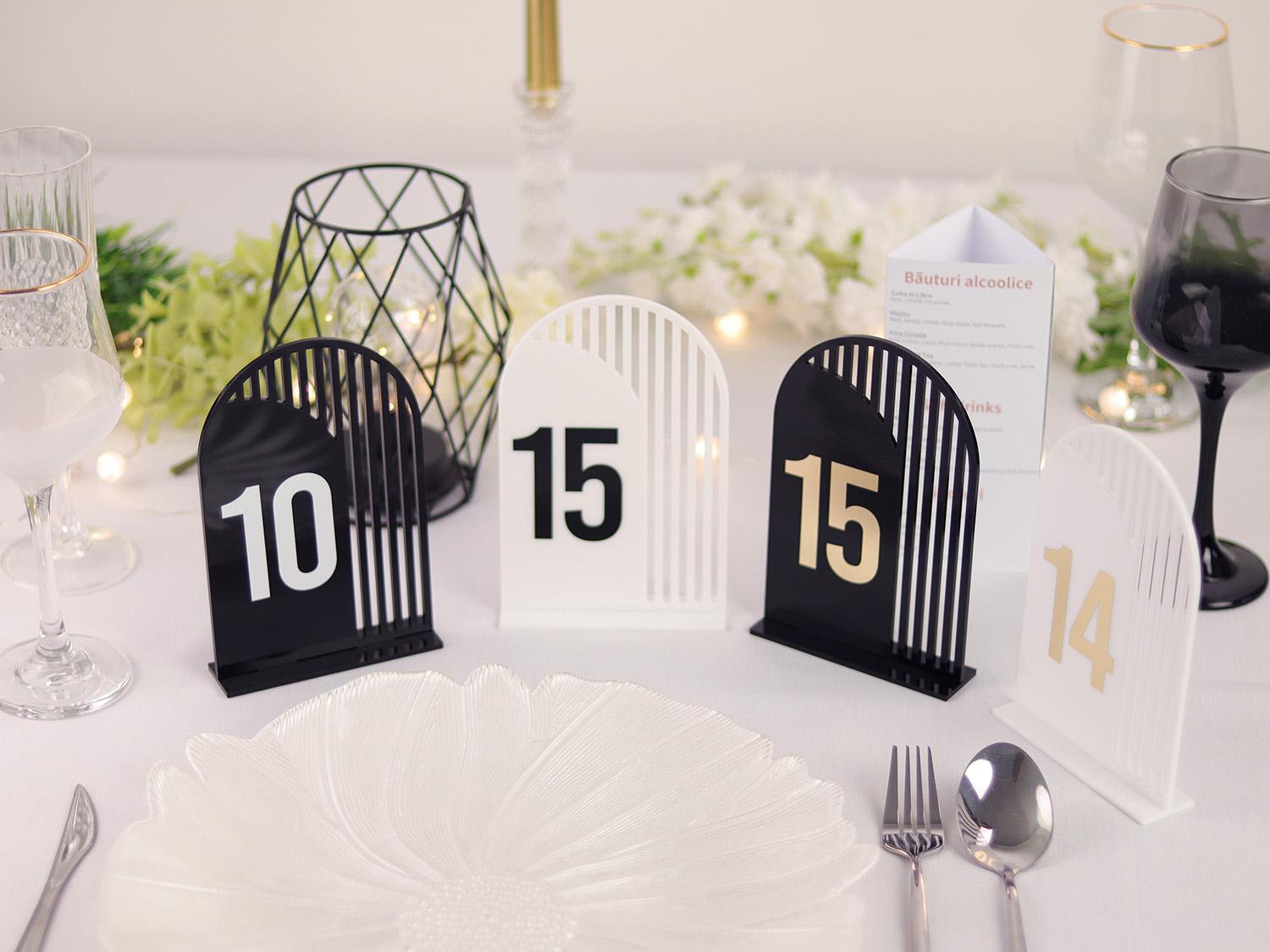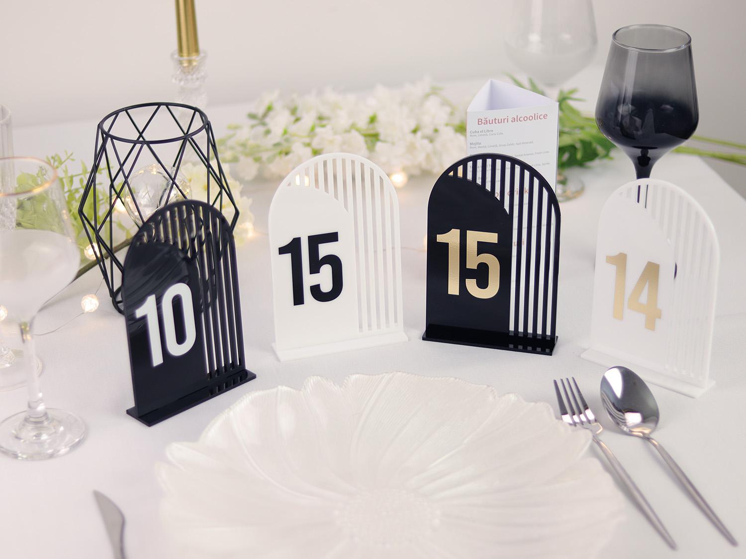 Aceste numere de masă, realizate din plexiglas durabil, aduc o notă de eleganță contemporană la orice eveniment special. Fiecare piesă este tăiată precis pe laser în forme semiovale asimetrice, creând un design rafinat și unic. Autocolantul aplicat completează aspectul stilat, disponibil în variante de culori atractive care se integrează perfect în decorul nunților, botezurilor sau altor evenimente. Finisajul neted și liniile curate fac ca aceste numere de masă să iasă în evidență, oferind o soluție modernă și de impact pentru organizarea meselor tale.