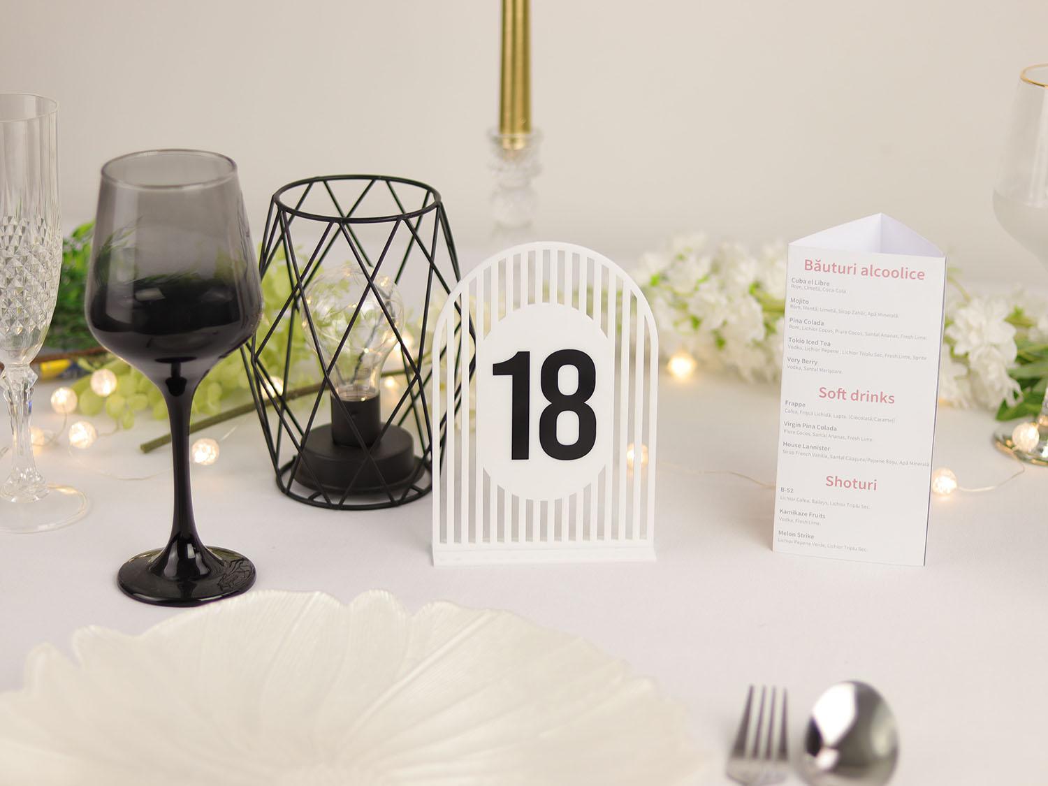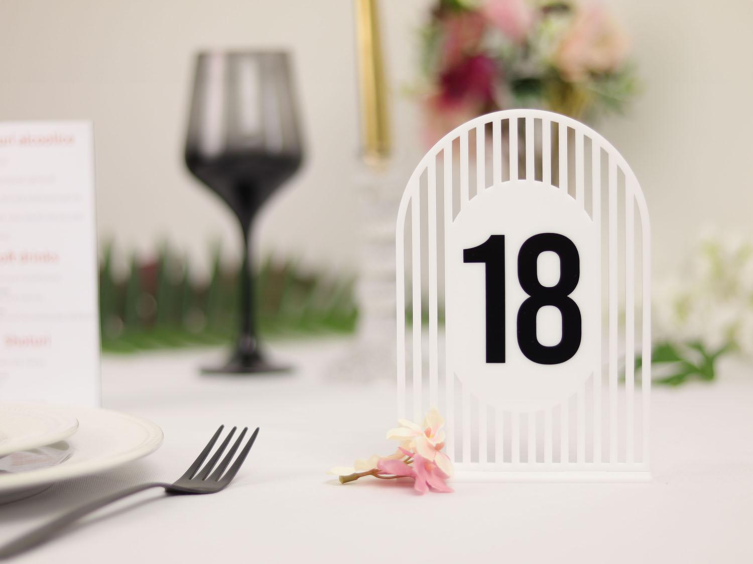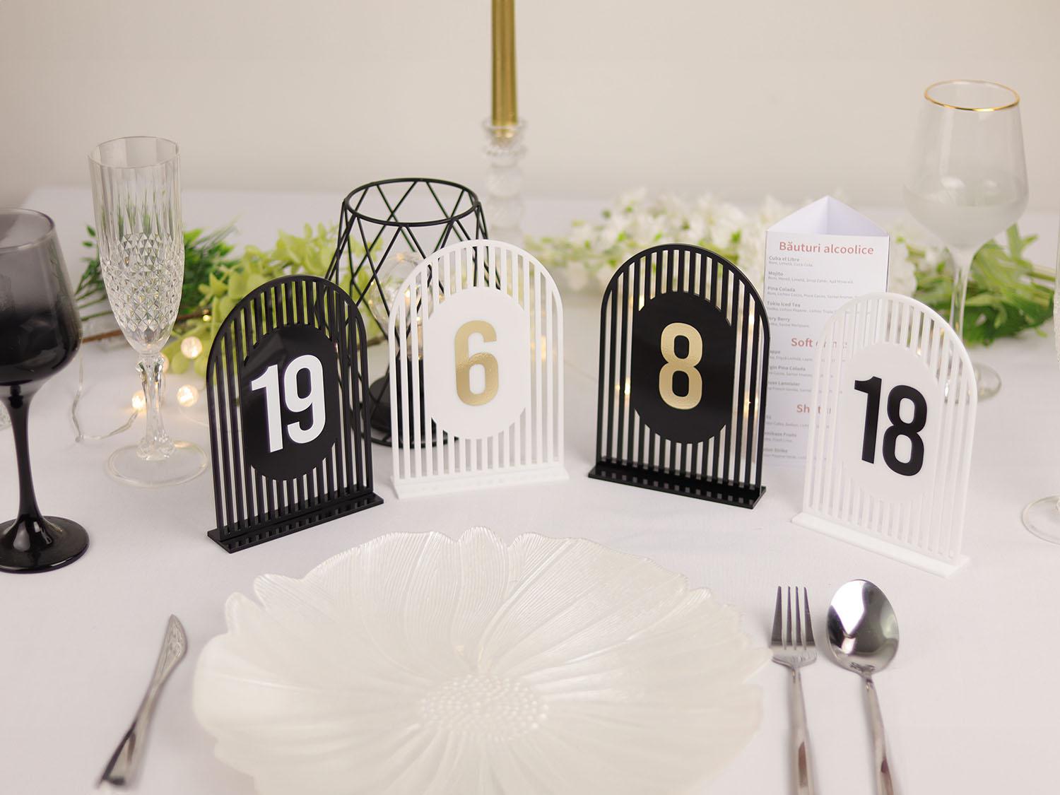 Un plus de eleganță modernă și rafinament decorului evenimentului tău cu aceste numere de masă din plexiglas semioval simetric, disponibile într-o combinație de culori sofisticate – alb sau negru, cu detalii aurii (autocolant gold). Fiecare număr este realizat cu un design simetric perfect, oferind o notă de echilibru vizual pe fiecare masă.