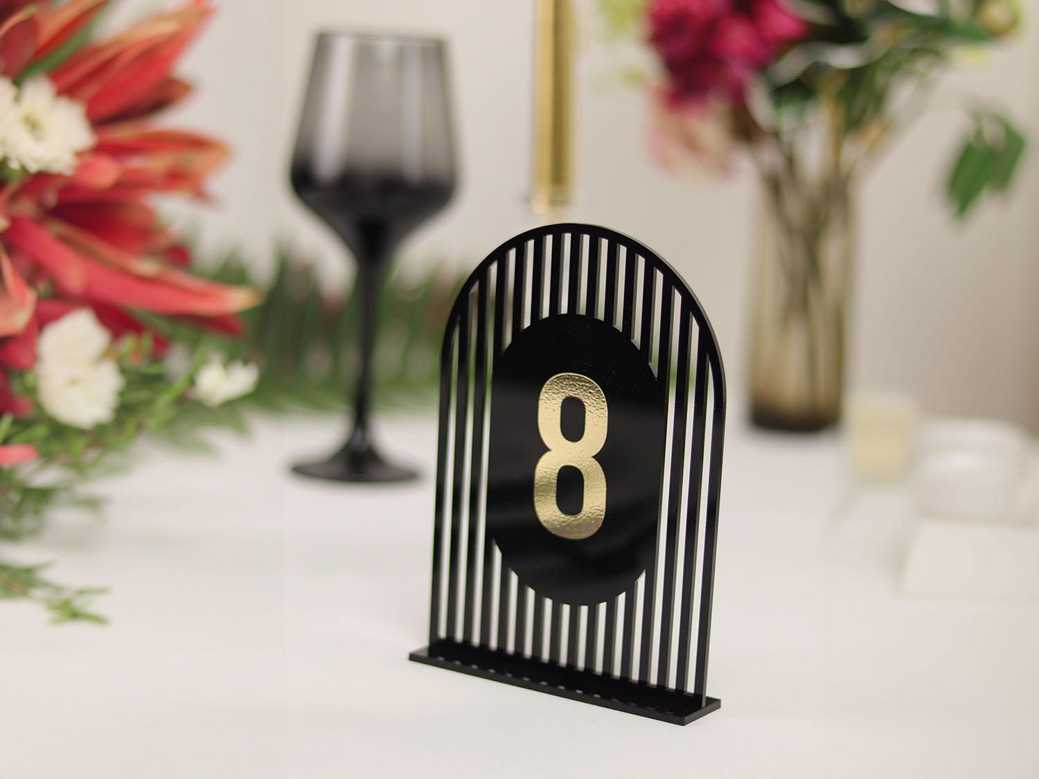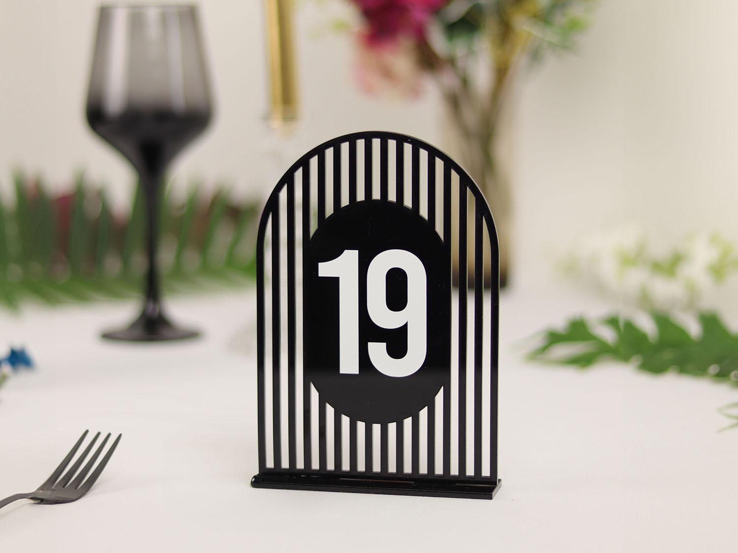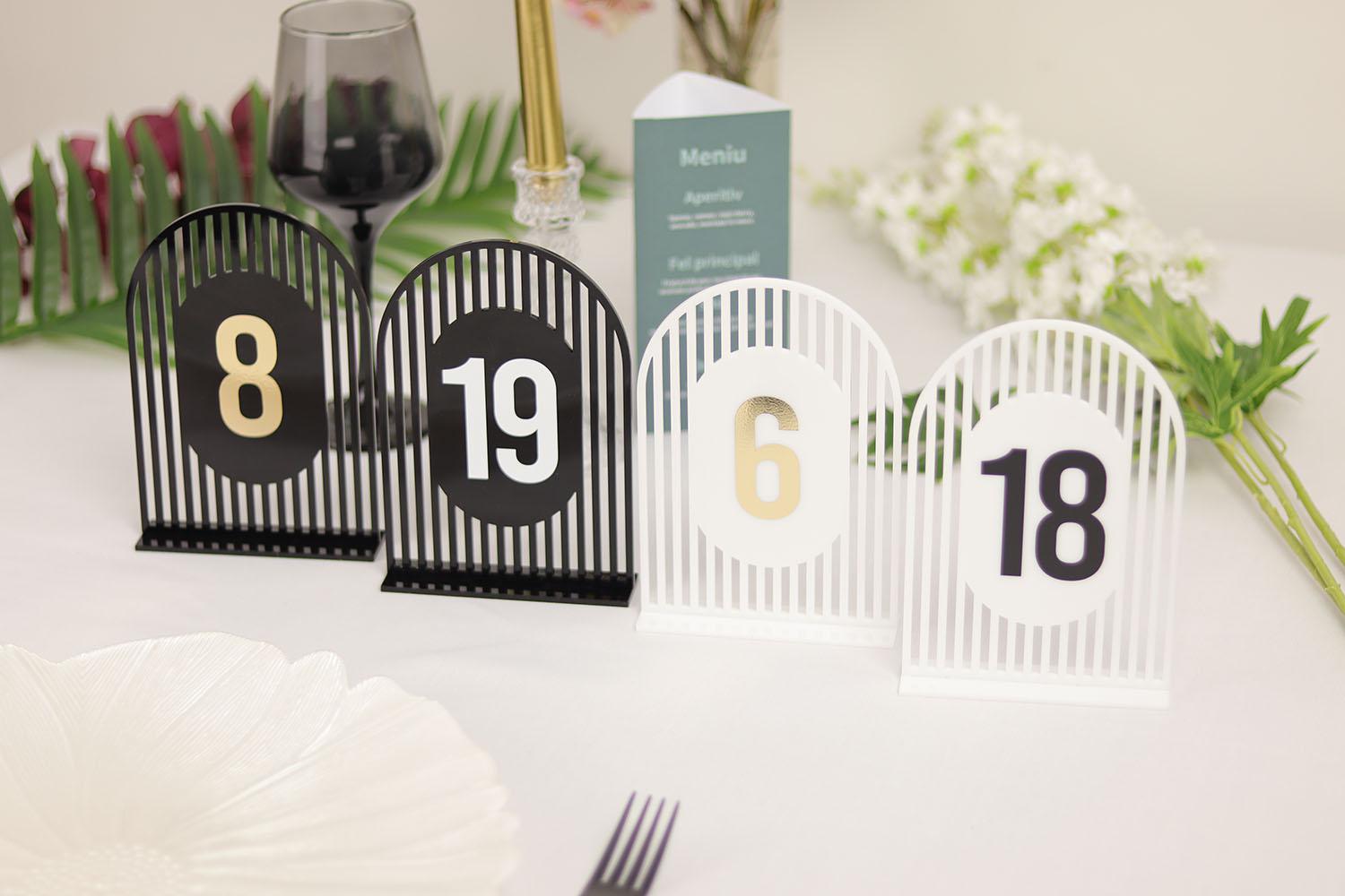 Un plus de eleganță modernă și rafinament decorului evenimentului tău cu aceste numere de masă din plexiglas semioval simetric, disponibile într-o combinație de culori sofisticate – alb sau negru, cu detalii aurii (autocolant gold). Fiecare număr este realizat cu un design simetric perfect, oferind o notă de echilibru vizual pe fiecare masă.