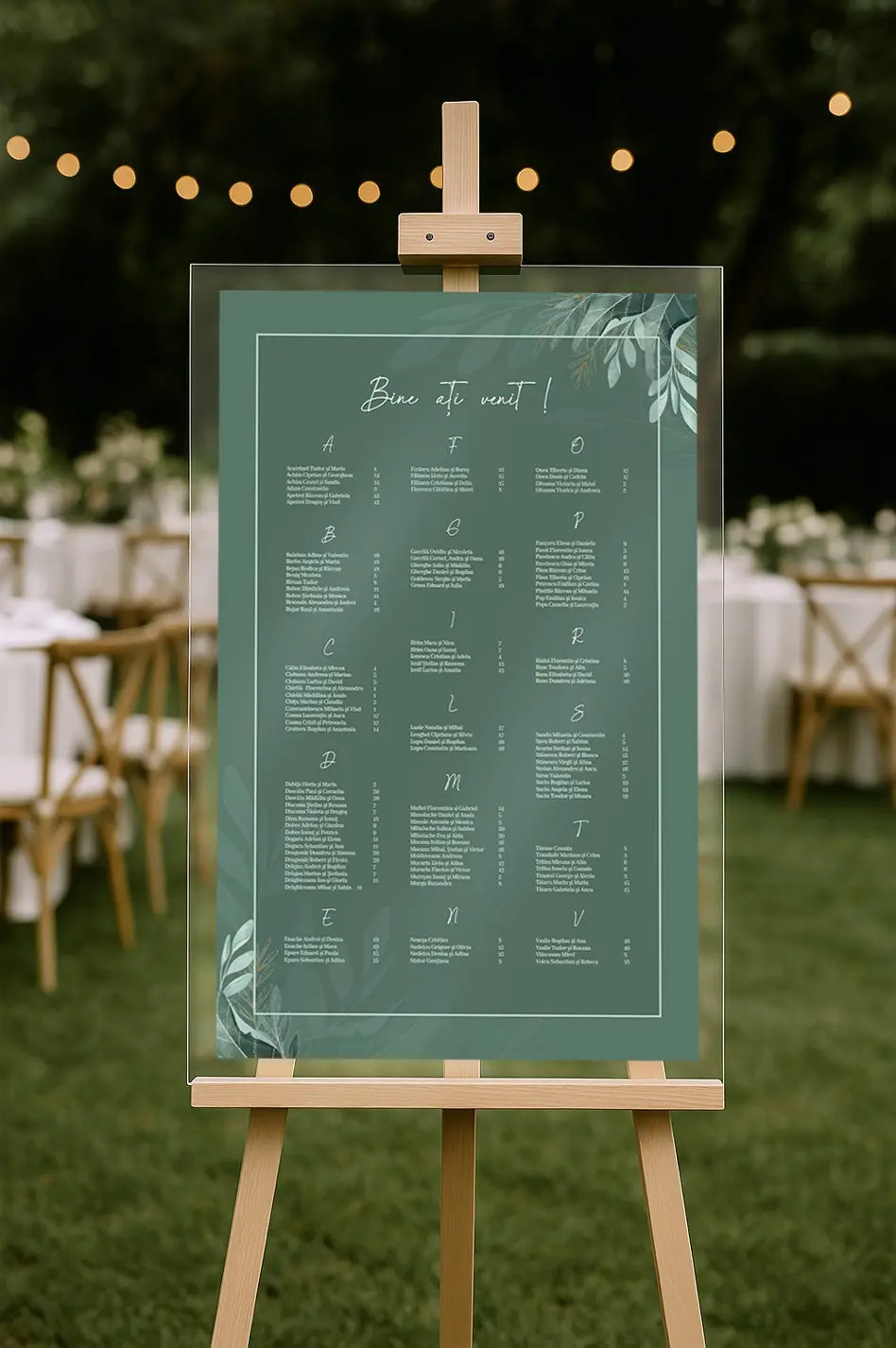 Listă invitați imprimată pe format portret 54x74 cm, cu aranjare alfabetică. Design elegant, text clar – ideal pentru nunți sofisticate.
