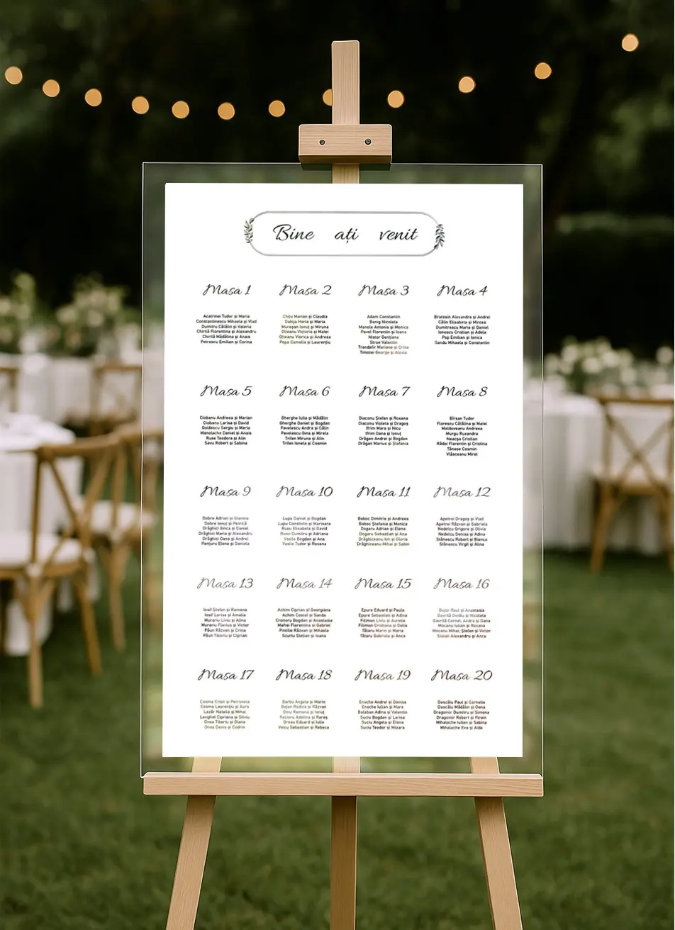 Un model minimalist pentru organizarea elegantă a meselor la nuntă. Listă invitați imprimată direct pe plexiglas transparent, cu text negru clar și modern.
