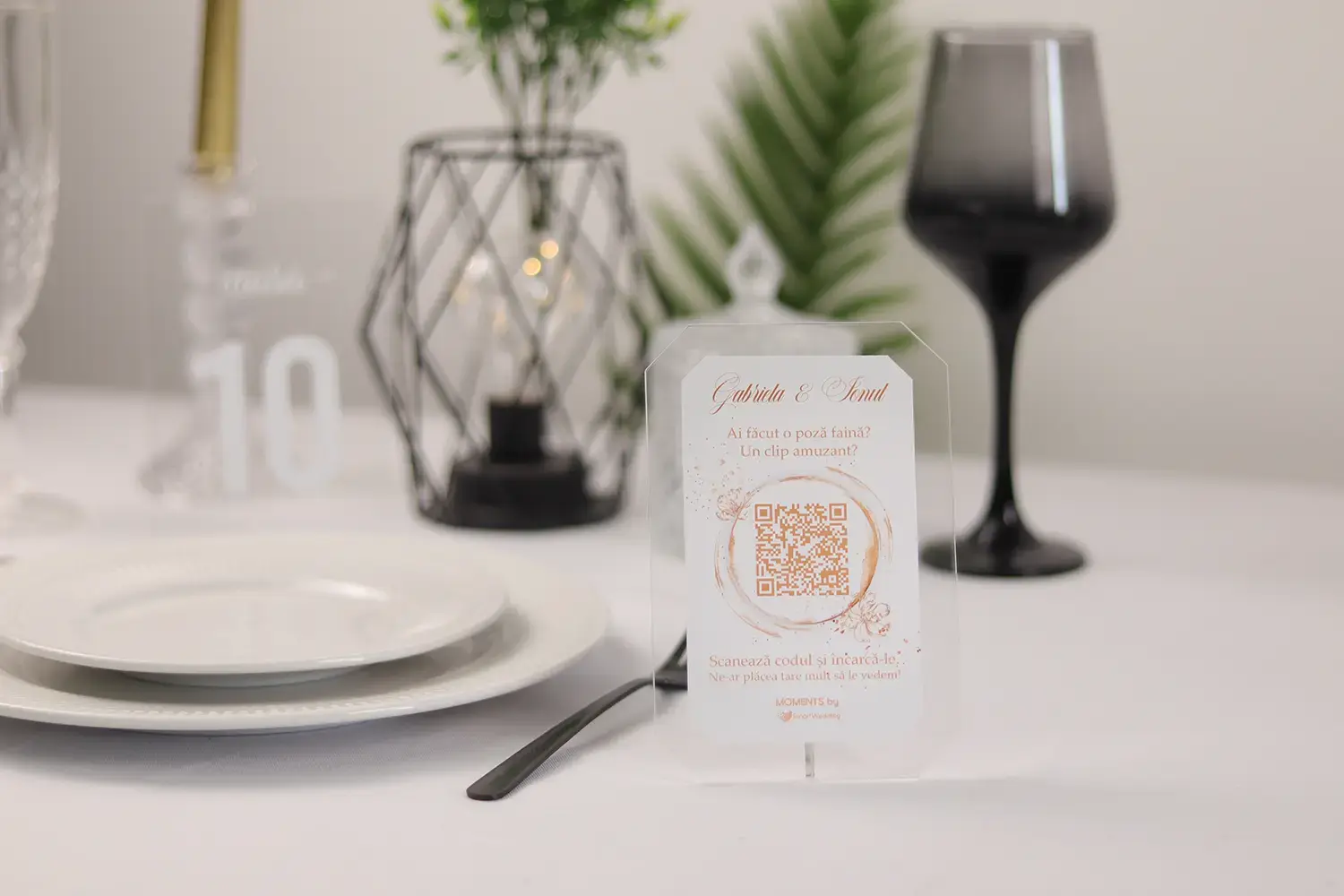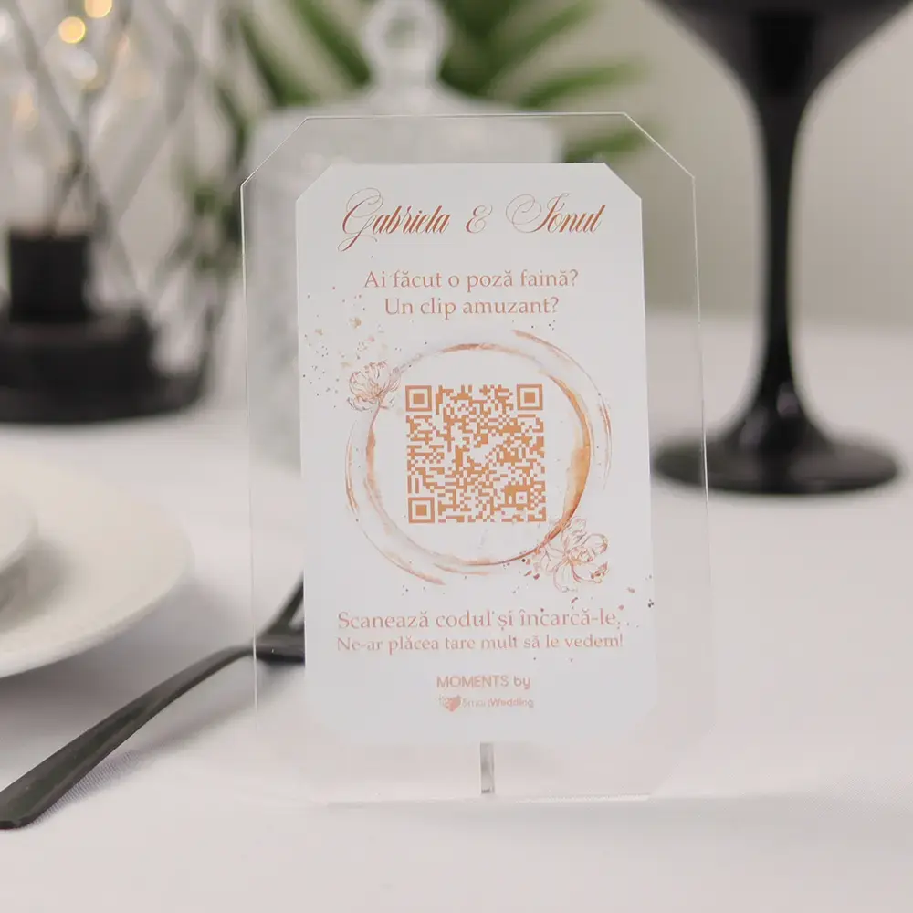 📸 Suport elegant din plexiglas transparent, ideal pentru a fi amplasat pe mesele invitaților la nuntă. Codul QR imprimat discret le permite oaspeților să scaneze rapid și să urce fotografii, videoclipuri și mesaje direct în galeria Moments.