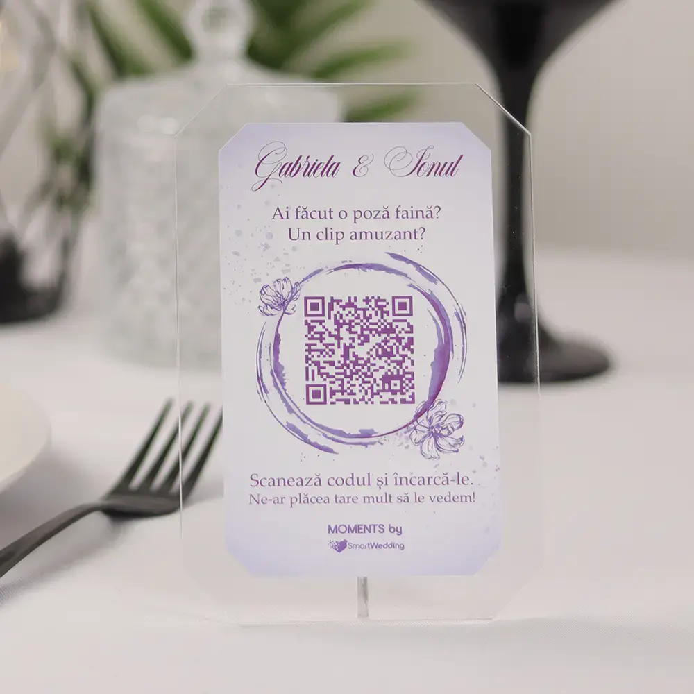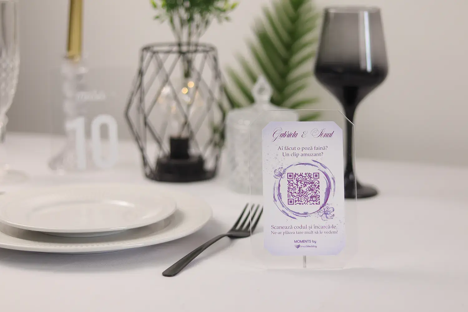 📸 Suport elegant din plexiglas transparent, ideal pentru a fi amplasat pe mesele invitaților la nuntă. Codul QR imprimat discret le permite oaspeților să scaneze rapid și să urce fotografii, videoclipuri și mesaje direct în galeria Moments.